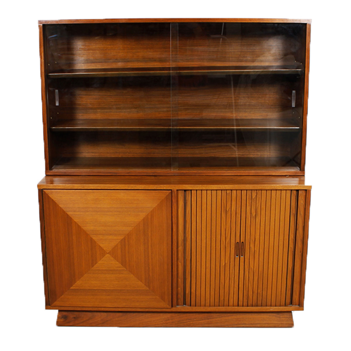 The front of the bottom is divided into two sections. There is a door with a raised diamond design, reminiscent of Vladimir Kagan. Next to the diamond is a double tambour door. Each of these doors opens to a space with an adjustable shelf providing lots of storage. Above, the glass cabinet, 12″ deep, has two sliding doors and two adjustable shelves where you can show off your most beautiful glass and barware, or a favorite collection.
