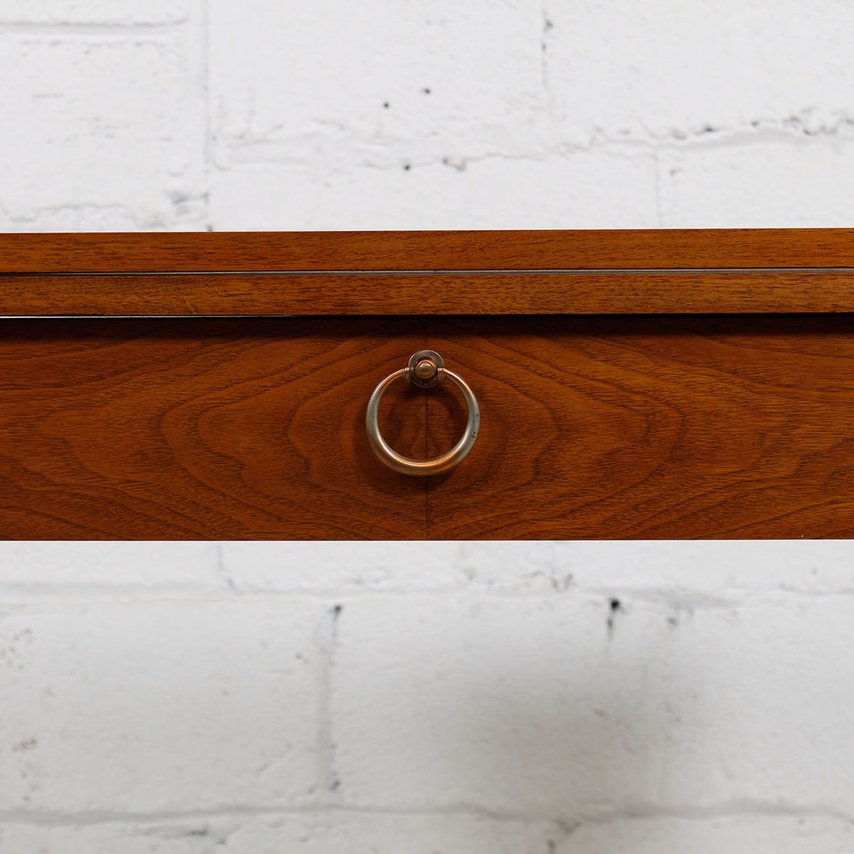 Closed, it makes a great end table or pier table in a hallway. Its two drawers and shelf maximize its storage capabilities. The piece is finished with the addition of a simple circle pull on each drawer. Beautiful and thoughtfully placed graining of the wood attest to the high quality of this mid-century piece.