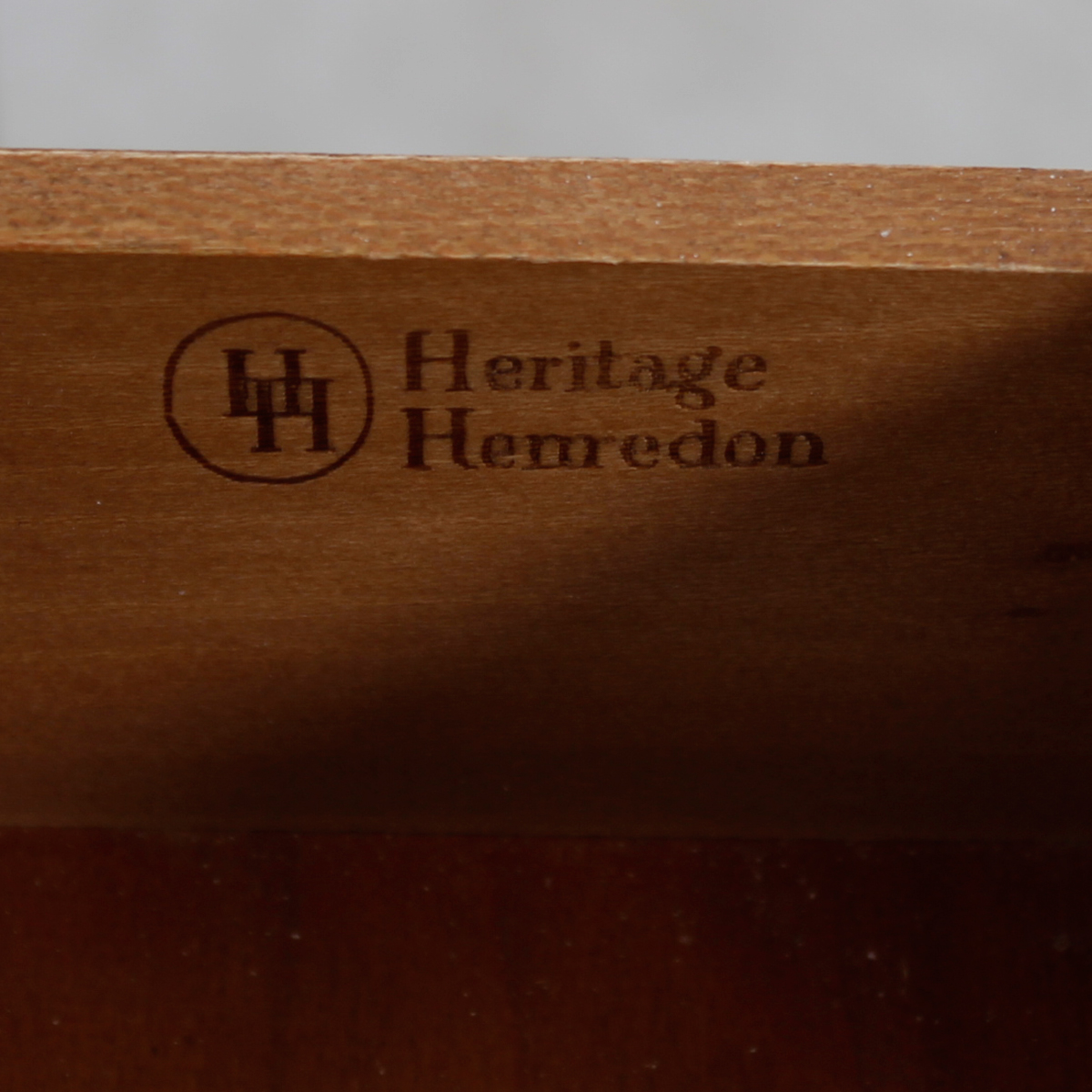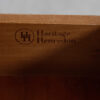 This handsome walnut dresser by Heritage Henredon dates to the 1950s & is as Solid As A Rock! Exhibiting the quality craftsmanship that higher-end manufacturers in America were known for at the time, Henredon has created a look for this suite of furniture that is somewhat traditional yet thoroughly modern – in other words: timeless! Its distinguishing feature is the beautiful wooden handle on each drawer with copper-finished hardware, complementing the warm tones of the walnut. On this, a straightforward five drawer dresser, the single handle on each drawer is the focus of the piece.