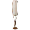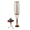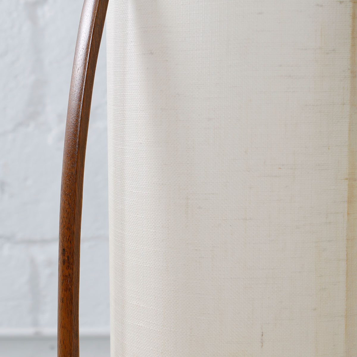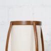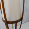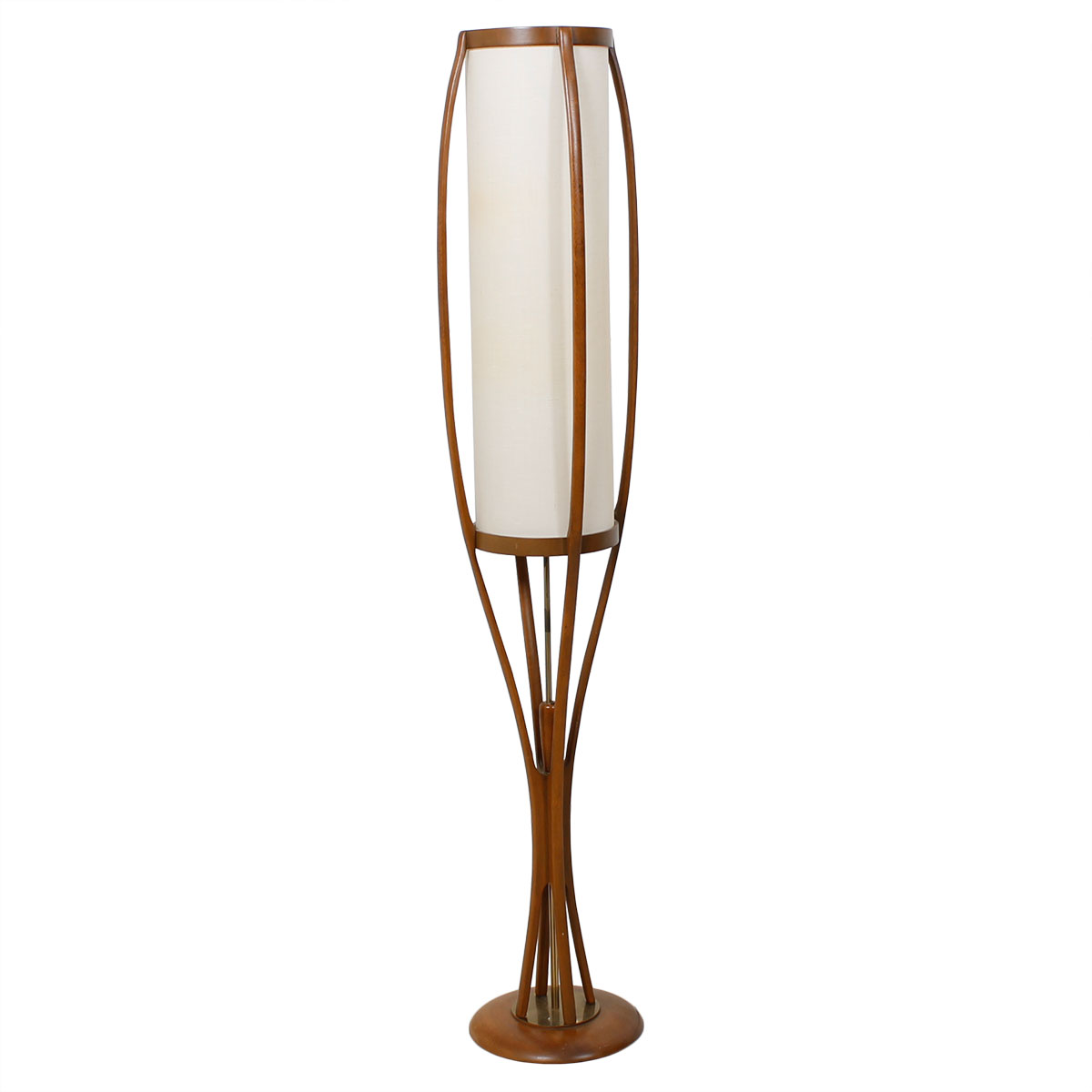 It’s so hard to find vintage lamps with their shades in great condition yet here we have a suberb MCM floor lamp not only with its original shade intact but it’s also a real statement piece. It has four gently curving walnut “ribs” cradling a long linen shade in which the lighting is housed. The wooden ribs come together below before ending in a circular base. Attributed to Adrian Pearsall.