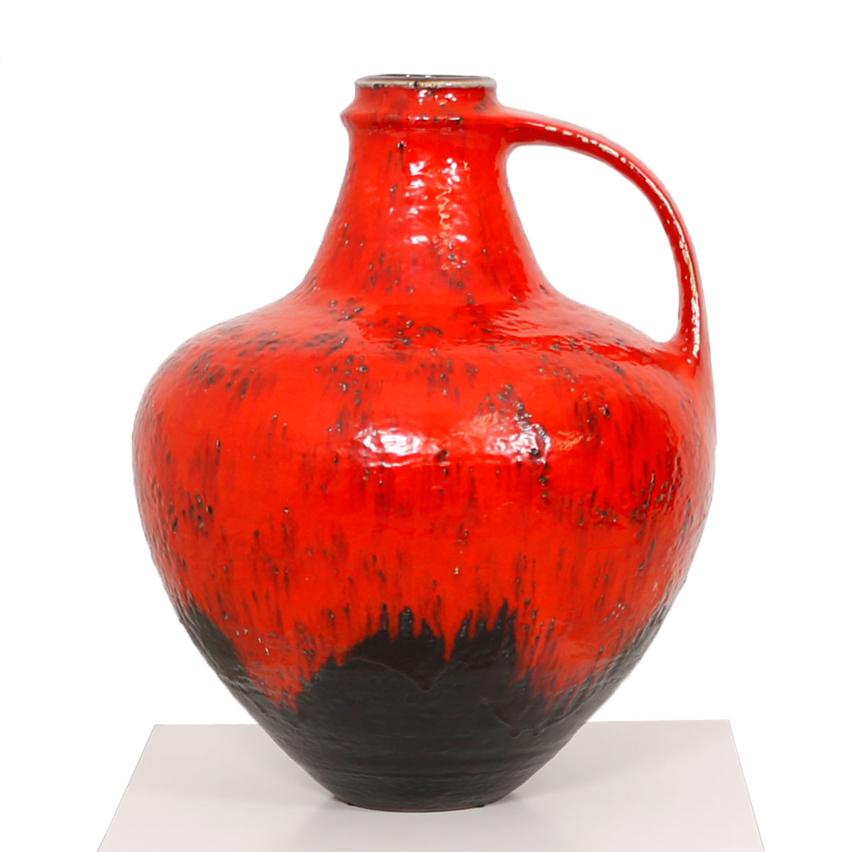 Absolutely magnificent West German pottery jug! Glazed in brown and then painted three quarters down with a red-orange glaze, stippled to give a mottled effect. Has a beautiful form accentuated by a thin handle. Extremely rare to find these West German pieces in this size!