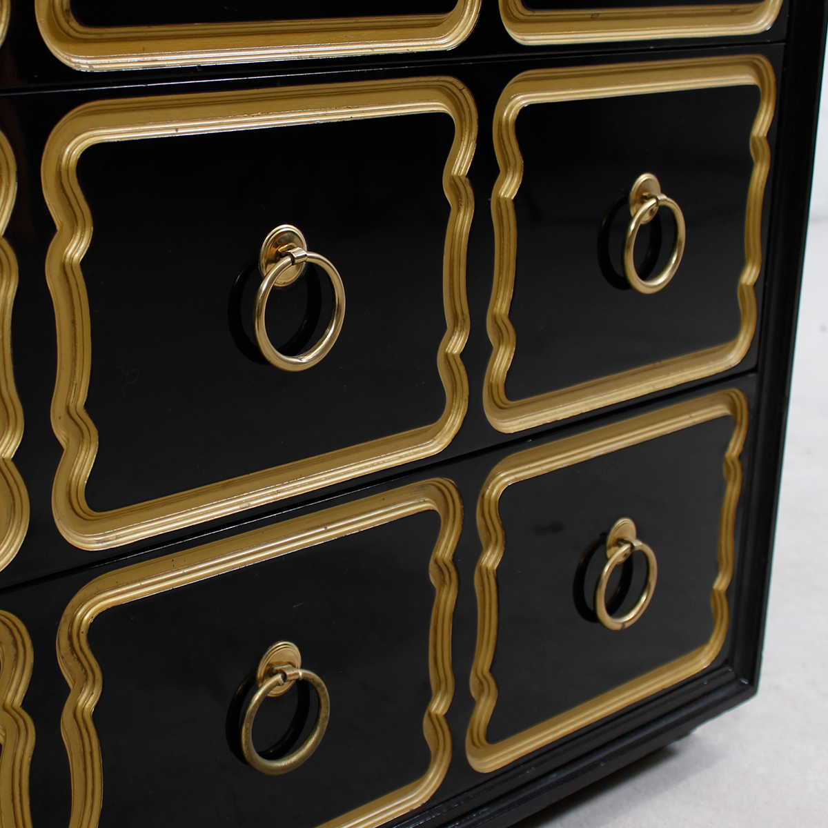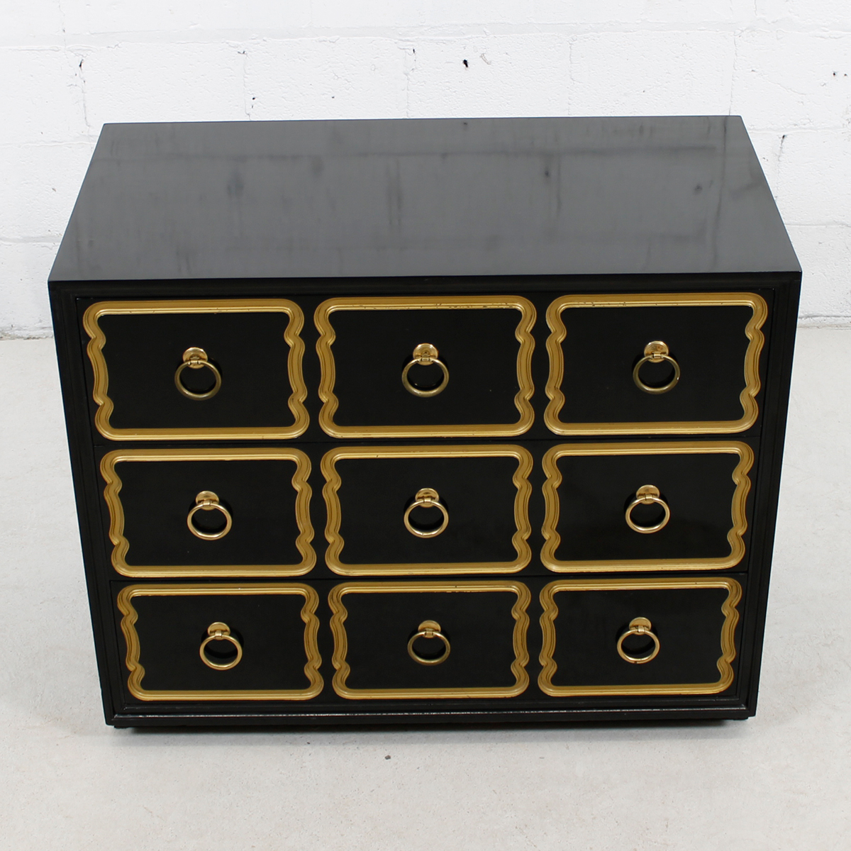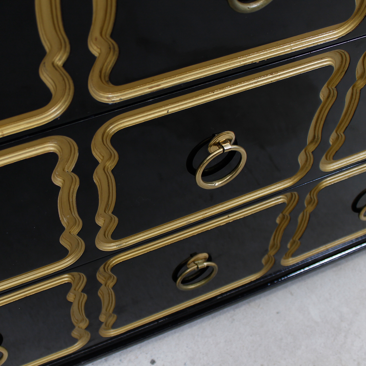 This beautiful and dramatic Hollywood Regency chest of drawers was designed by Dorothy Draper for Heritage Henredon ‘España’ line. It has a high gloss ebony lacquer finish with gilt decoration outlining the drawers. Each drawer has a brass ring pull. There are nine good-sized drawers. Despite being a strong statement piece on its own, this dresser mixes well with many other styles.