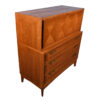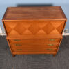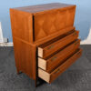 We are proud to offer this stunning American mid-century tall dresser. A panel, set back from the lower area, features a front of wood inlaid to form diamonds. Below, there are three deep drawers, each having a beautiful brass handle.