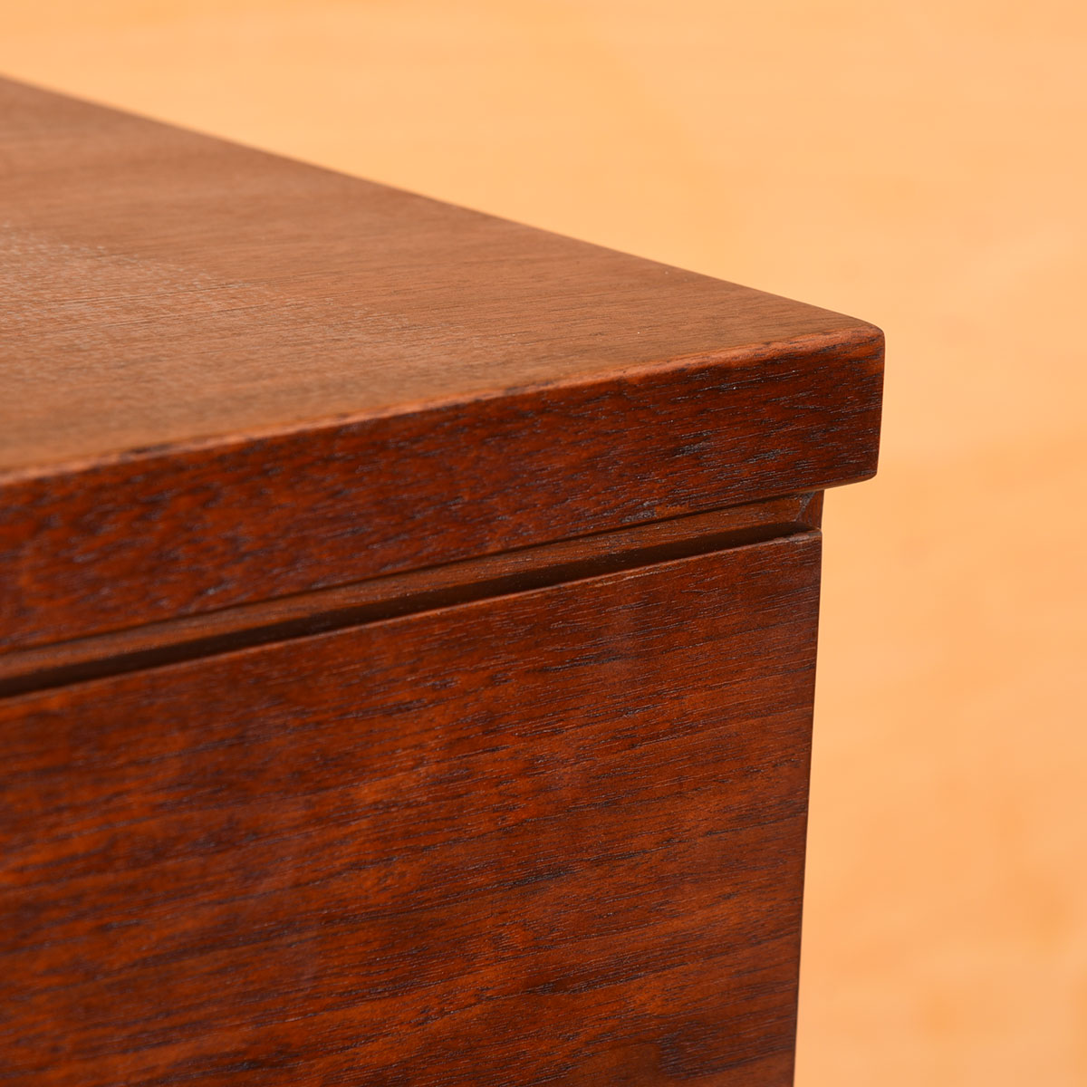 • A small pull of ebonized wood on each drawer punctuates the front of the piece and complements the walnut