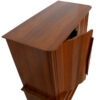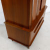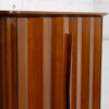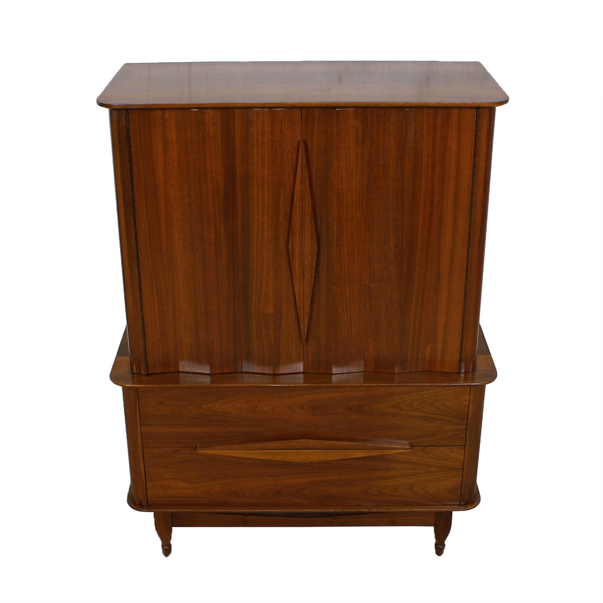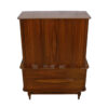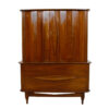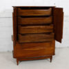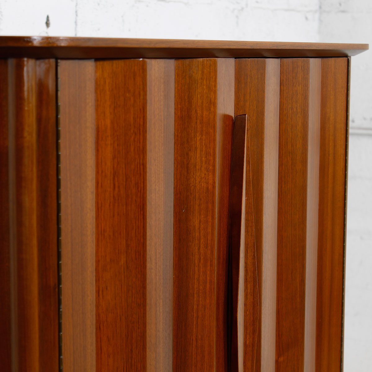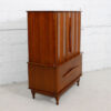 This super interesting tall dresser or gentleman’s chest was produced in the ’50s by the American manufacturer Cavalier, a “boutique” manufacturer known for high quality craftsmanship. This piece is distinguished by several remarkable features, most notably the vertically fluted front of the two doors on the upper portion. The corrugation catches the light and casts interesting shadows across the doors. The bottom, defined by a ledge around the middle is composed of two deep drawers.