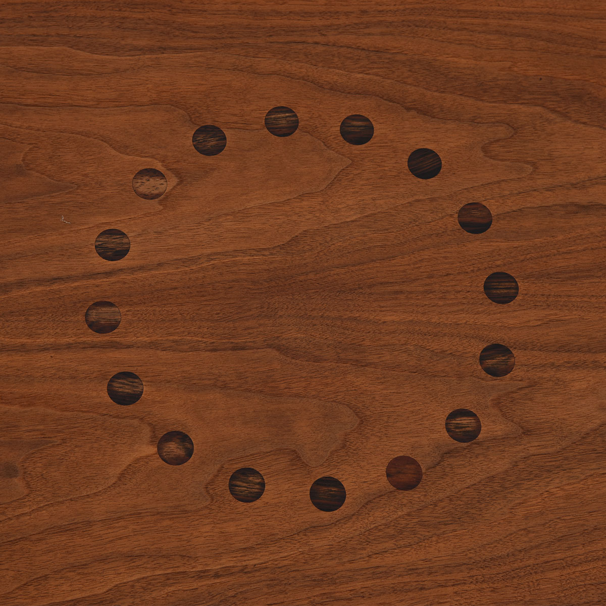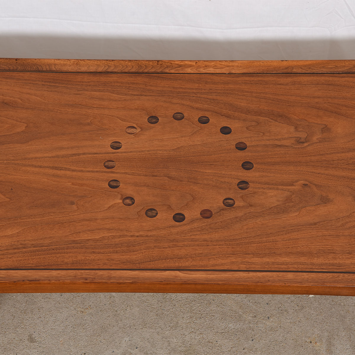 We’re pleased to offer this distinctive coffee table from the Drexel Declaration suite of furniture designed by Kipp Stewart in the 1950s. The table has clean, long lines and the walnut has aged to a warm patina. The table top is demarcated by a “circle of circles” — inlaid rosewood circles form a circle in the center of the table.