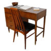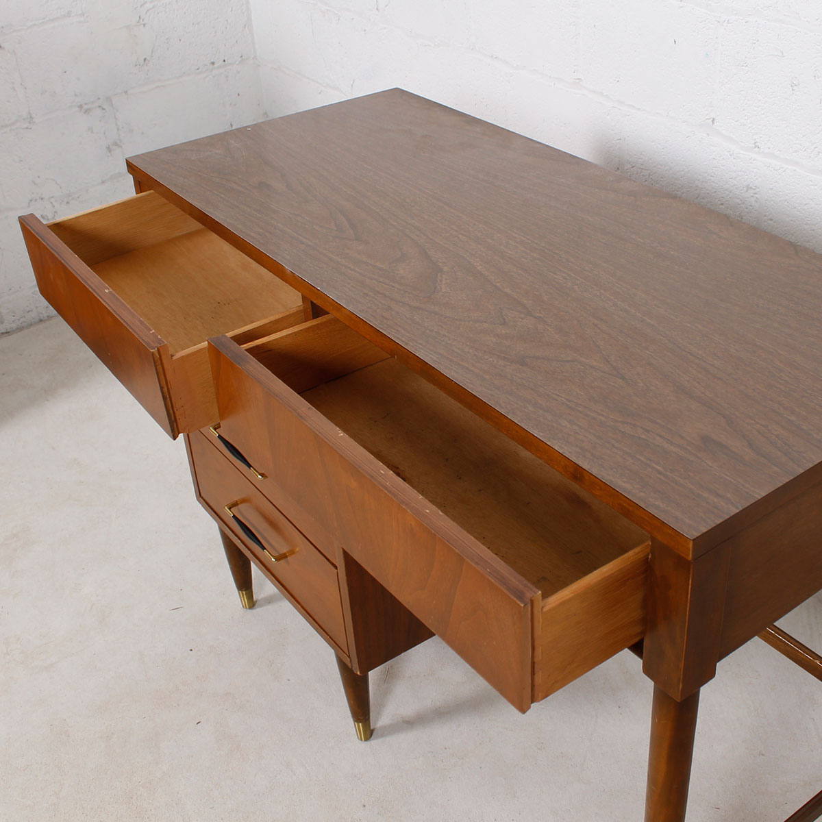 A sleek & compact Mid Century Modern desk that can easily serve as a work station for your laptop with drawers for organizing supplies. Includes a ‘double-deep’ drawer for putting files. The piece is perfect for a work space with its indestructible walnut-formica top. Includes a finished backside so that it can easily be placed in the middle of a room.
