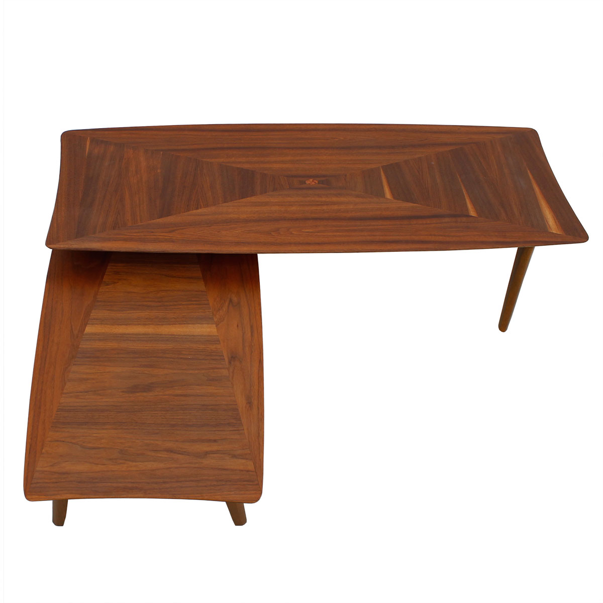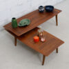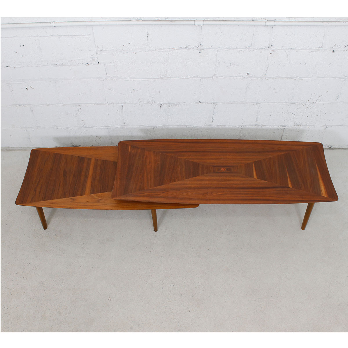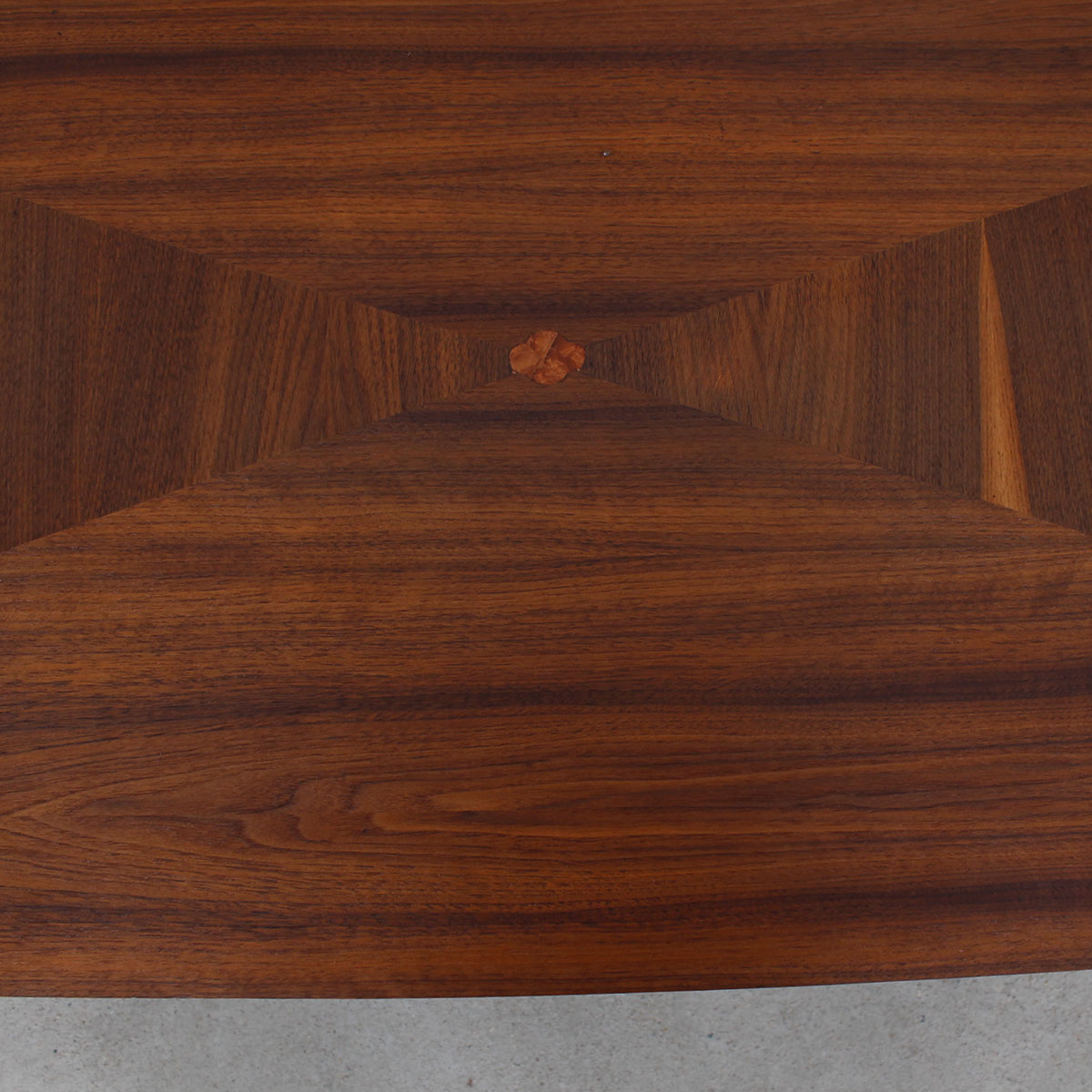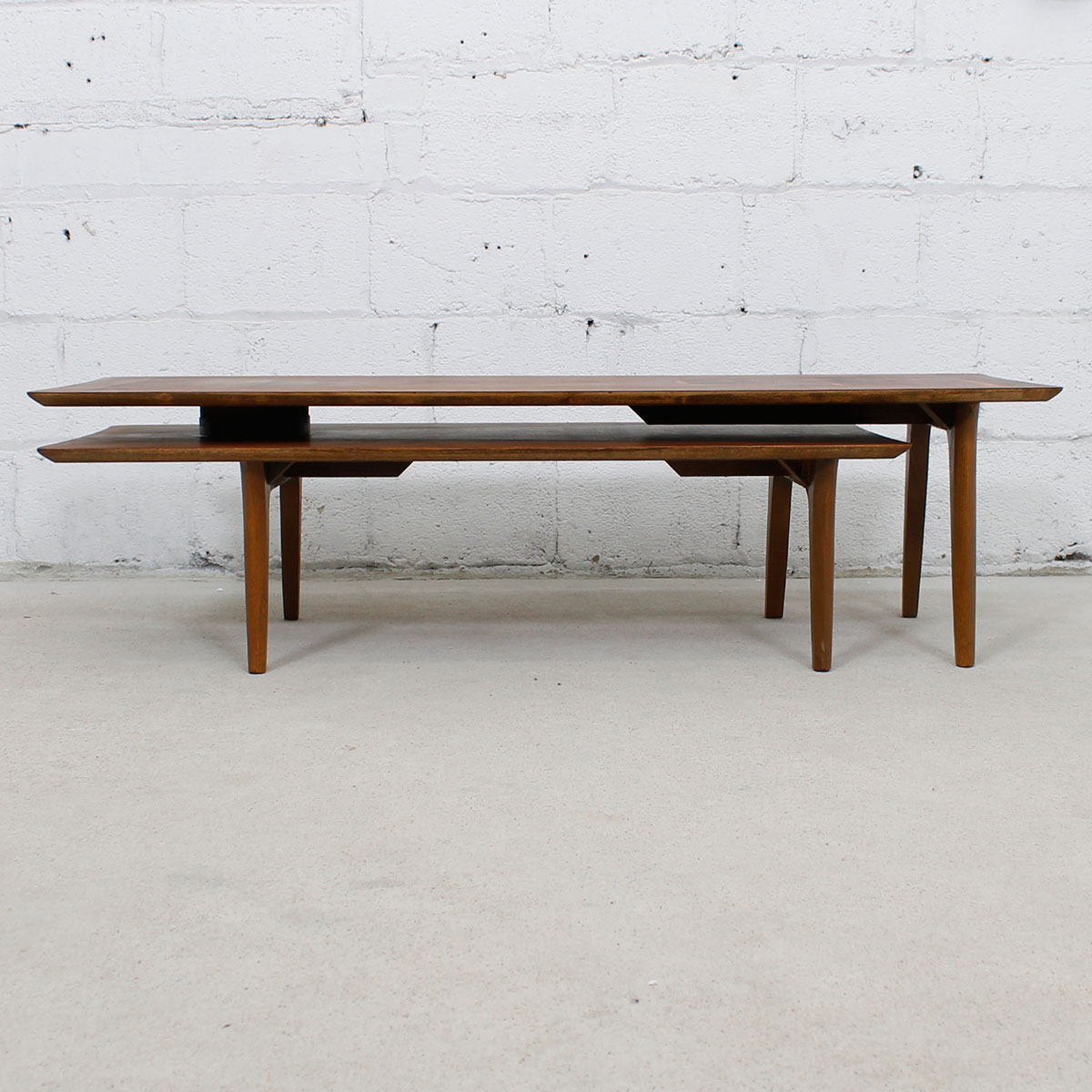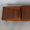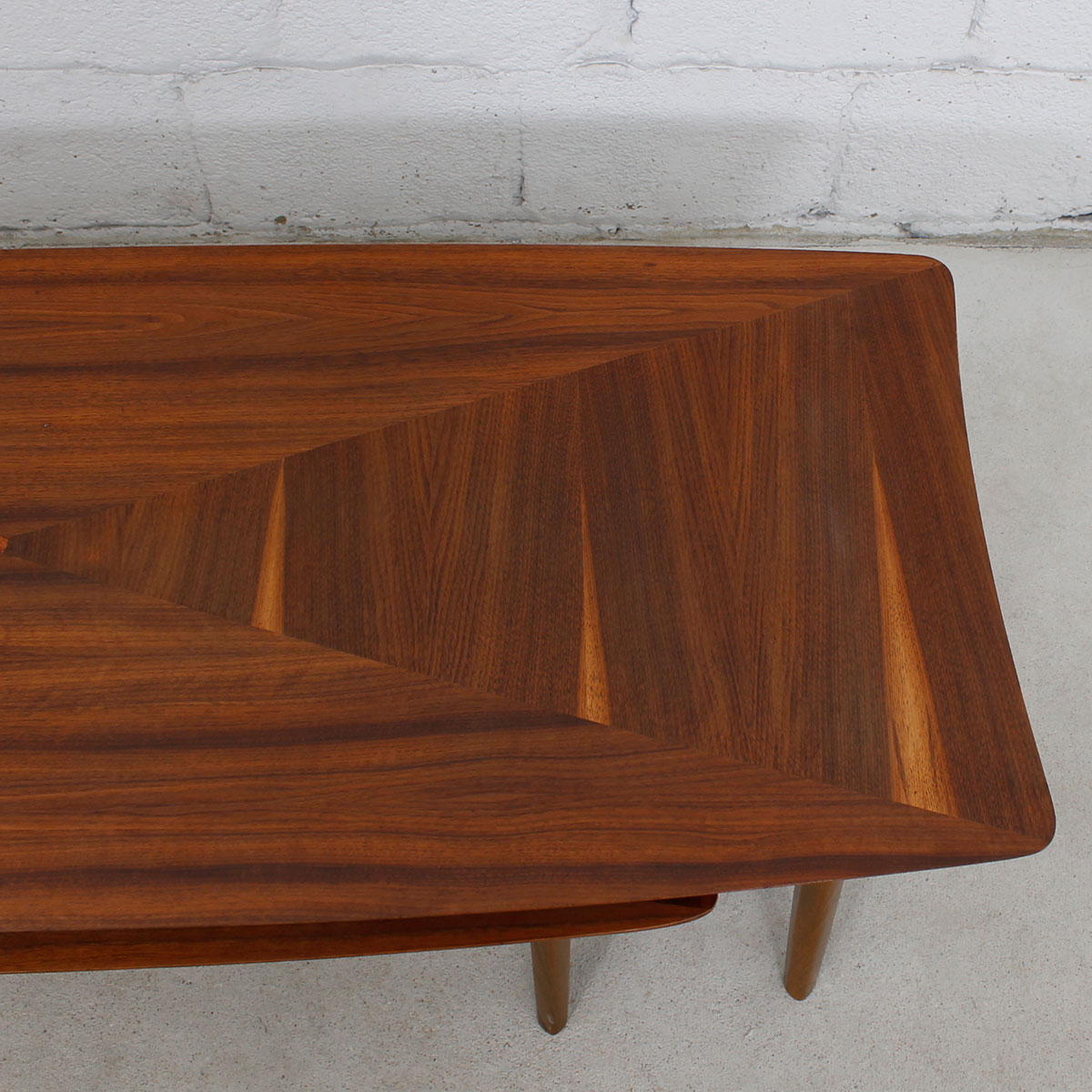 This mid-century walnut coffee table is amazing for many reasons. The wood grain on the table top is simply beautiful – but there’s not just one table — there is a second table attached underneath that swings out to form an “L” shape or one long, two-tiered table. The shape of the two table tops is very much of the period – curved corners, curved sides and concave ends.