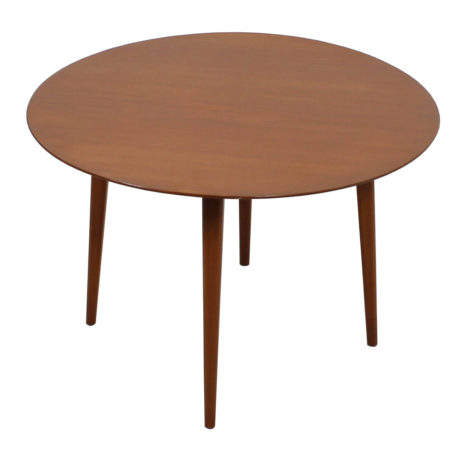 This simple yet beautiful round coffee table is in the style of Danish designer Hans Wegner. The round top has a thin edge making it appear as if it is nearly weightless, floating above the thin, tapered and slightly splayed legs. The round shape makes it an especially good choice for a sectional sofa or conversation pit.