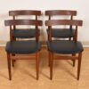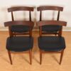 Ingenious MCM set of table and chairs in walnut. The chairs fit around the table into notches around the table top when not in use. The table splits apart to expand by way of a butterfly leaf which lifts up and folds open to add an additional 20″. The chairs have a simple backrest and an upholstered seat. The walnut has aged to a beautiful patina.