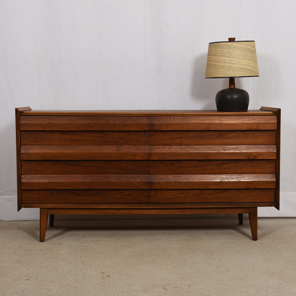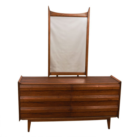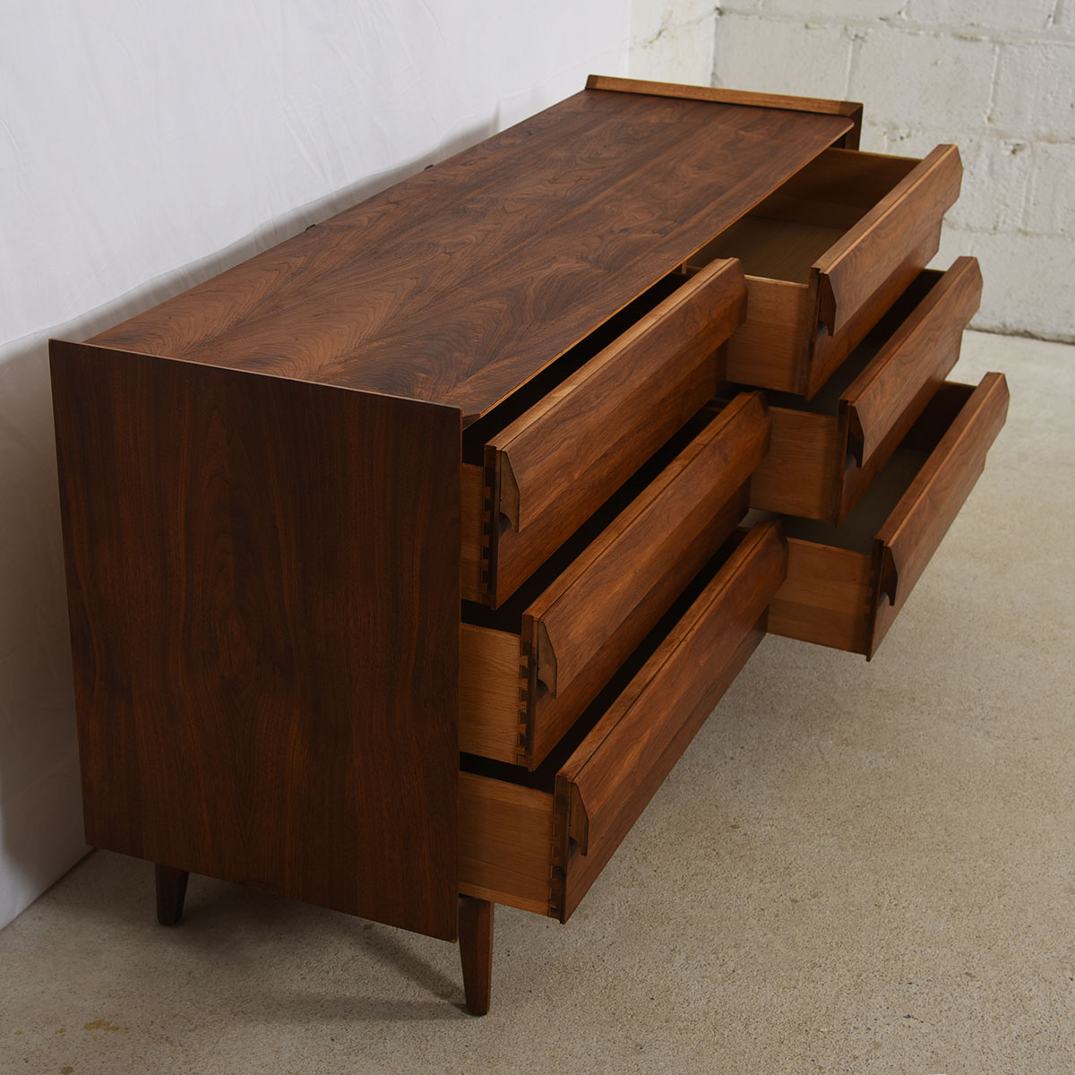 Compact Mid Century Walnut Long Dresser w/ Geometric Pulls