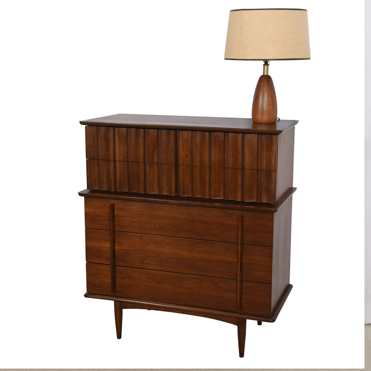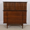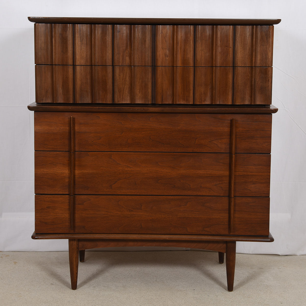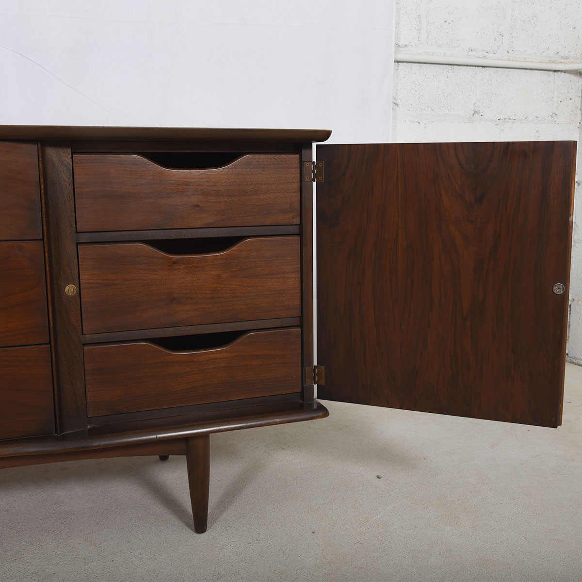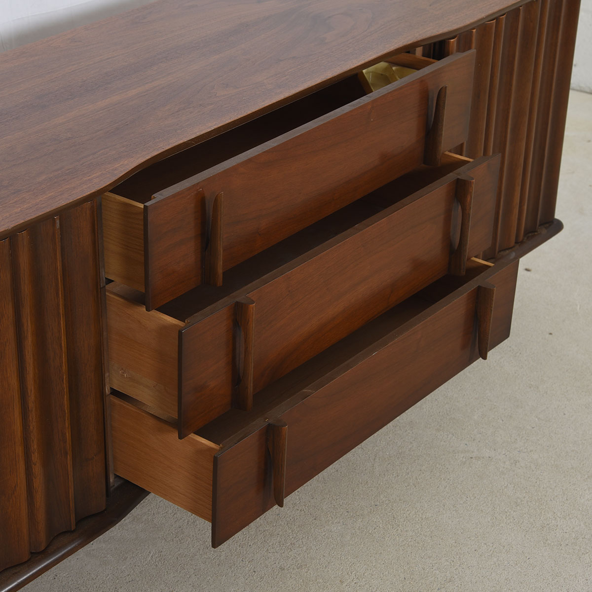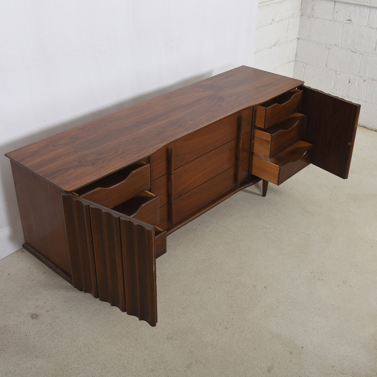 Old-school American craftsmanship is evident on this wonderful mid-century modern walnut long dresser or sideboard. It offers plentiful storage — three long drawers in the middle flanked by three drawers on each end hidden behind a door. The front has vertical sculptural detailing as seen in the handles on the long drawers, and on the corrugated front of the doors.