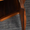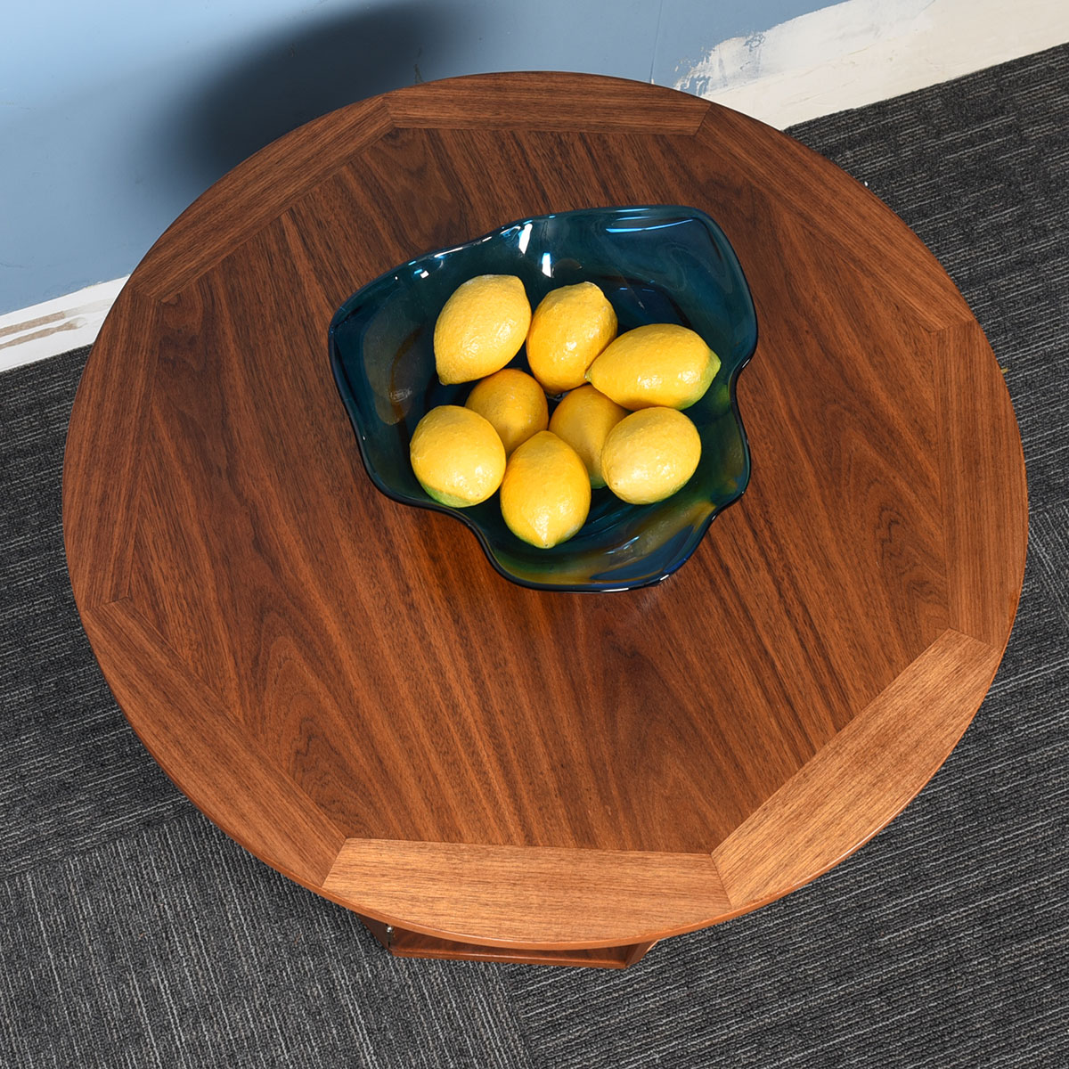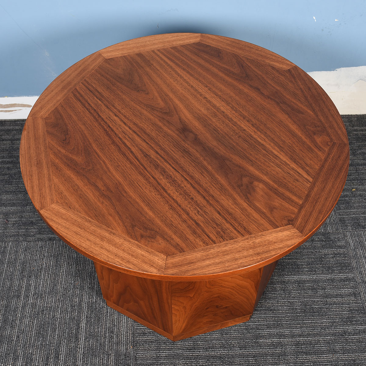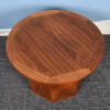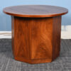A round table top of walnut is supported by a hexagonal base of walnut. A door on one of the side of the base opens to reveal secret storage. Perfect for toys! Beautiful figuring on the walnut.