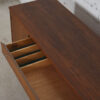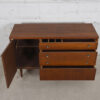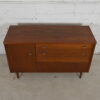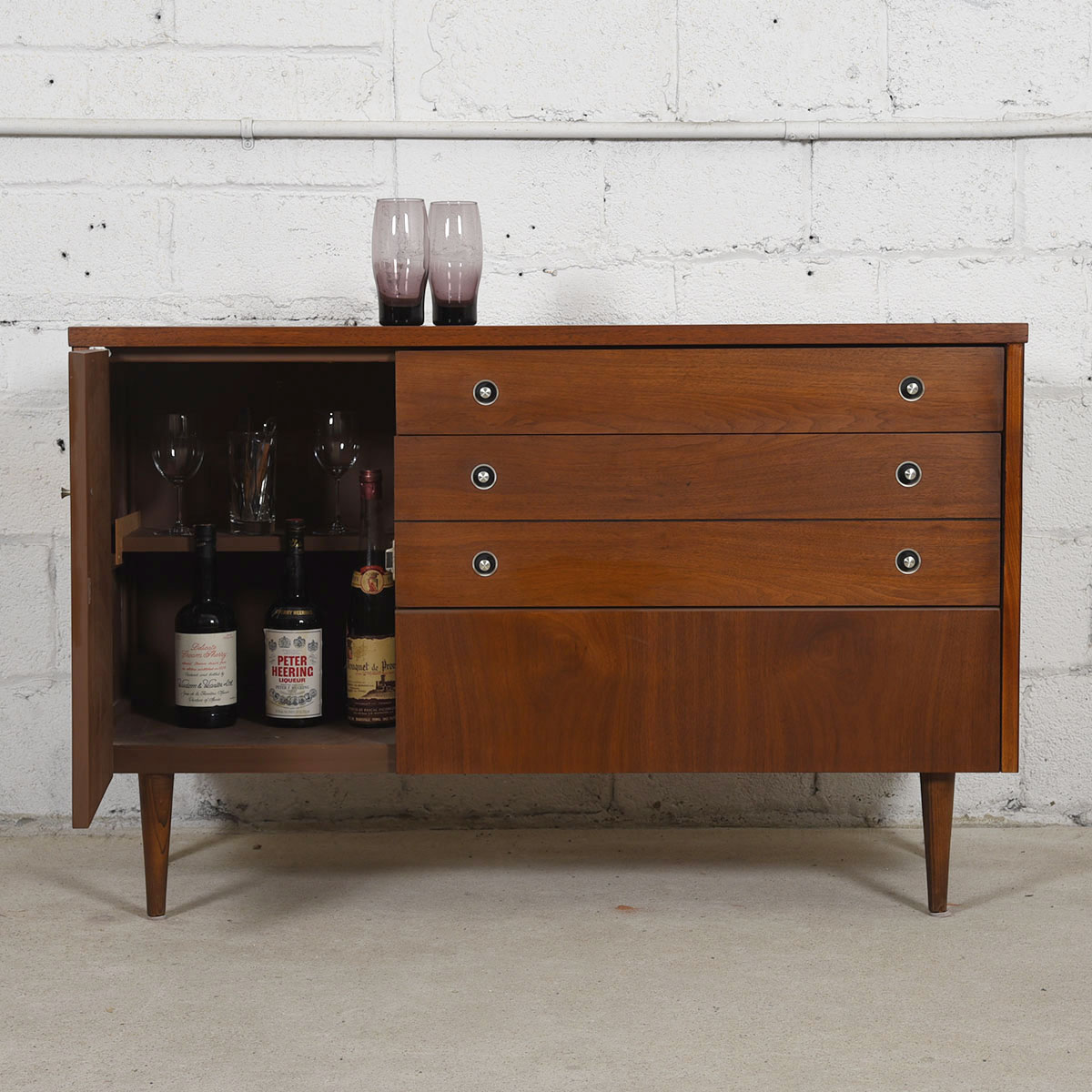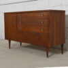 If you are seeking a compact and stylish sideboard / bar cabinet in the mid-century style, we offer this cabinet for your consideration. It offers plentiful storage yet has a smaller footprint making it ideal for urban homes. A door on the left opens to a deep cubby space with one shelf. The other two-thirds of the front features three drawers with small chrome knobs — a shallow one, a double drawer (looks like two smaller drawers) and a “hidden” drawer with a plain walnut front.