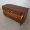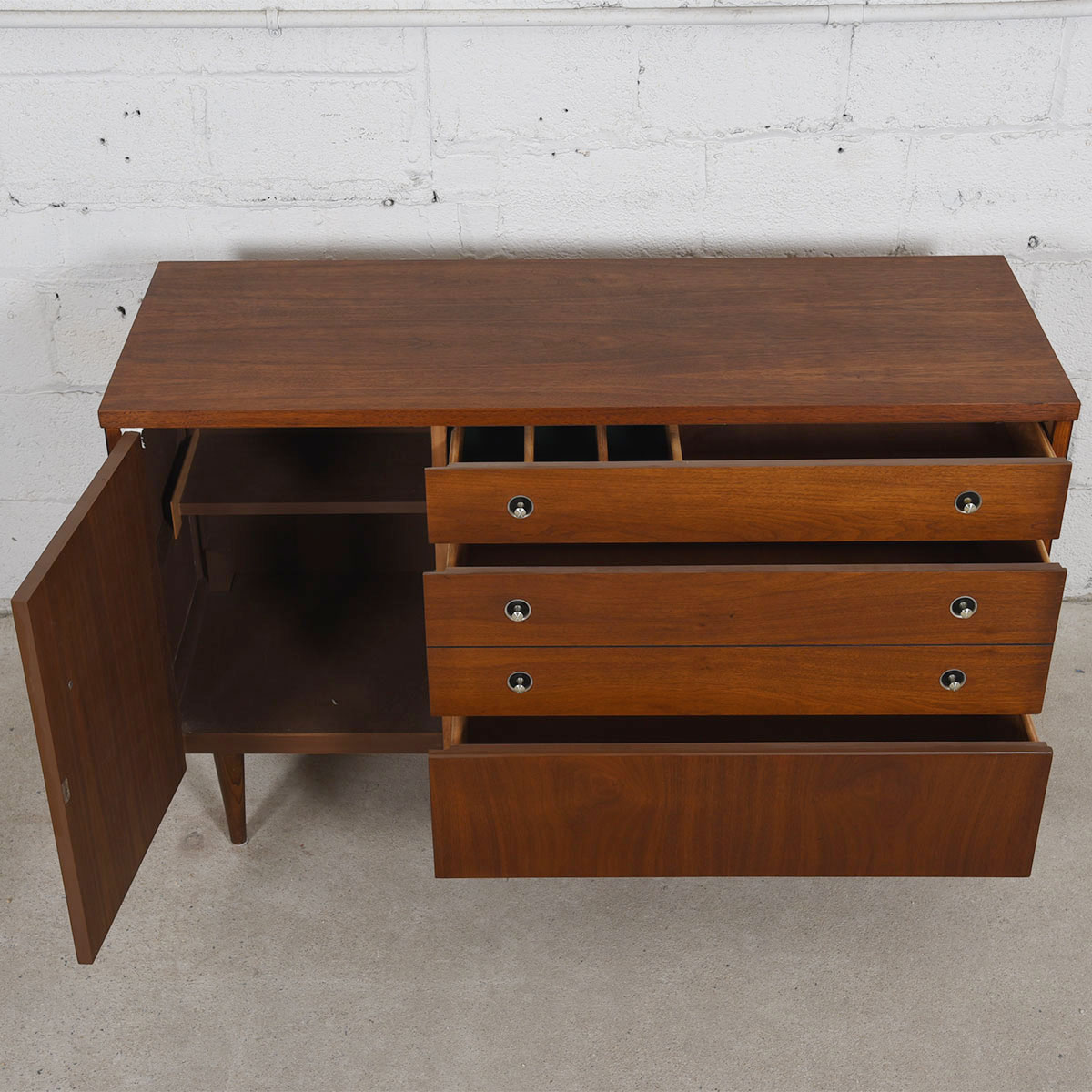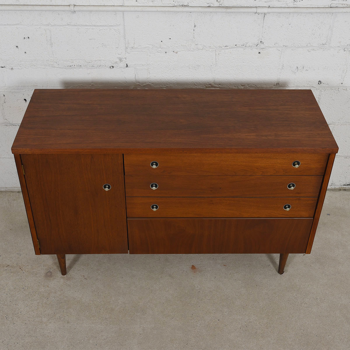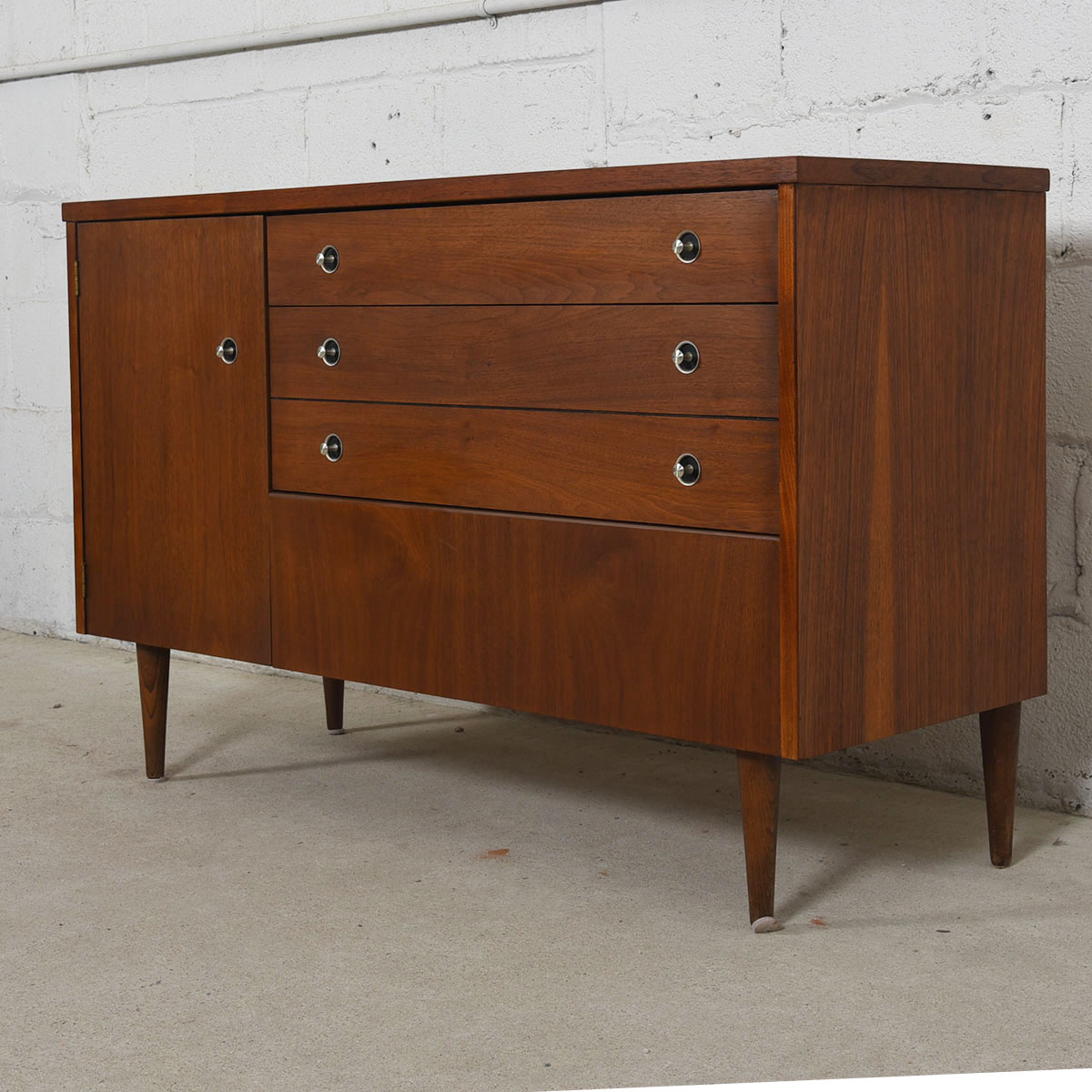 The walnut has aged to a glorious tone which the chrome knobs set off nicely. It’s elegant minimalism is heightened by the tapered legs its sits upon. In addition to serving as a sideboard, this cabinet could easily be a dresser or a storage piece in a home office. American built, its old school craftsmanship does not compare to anything made recently.