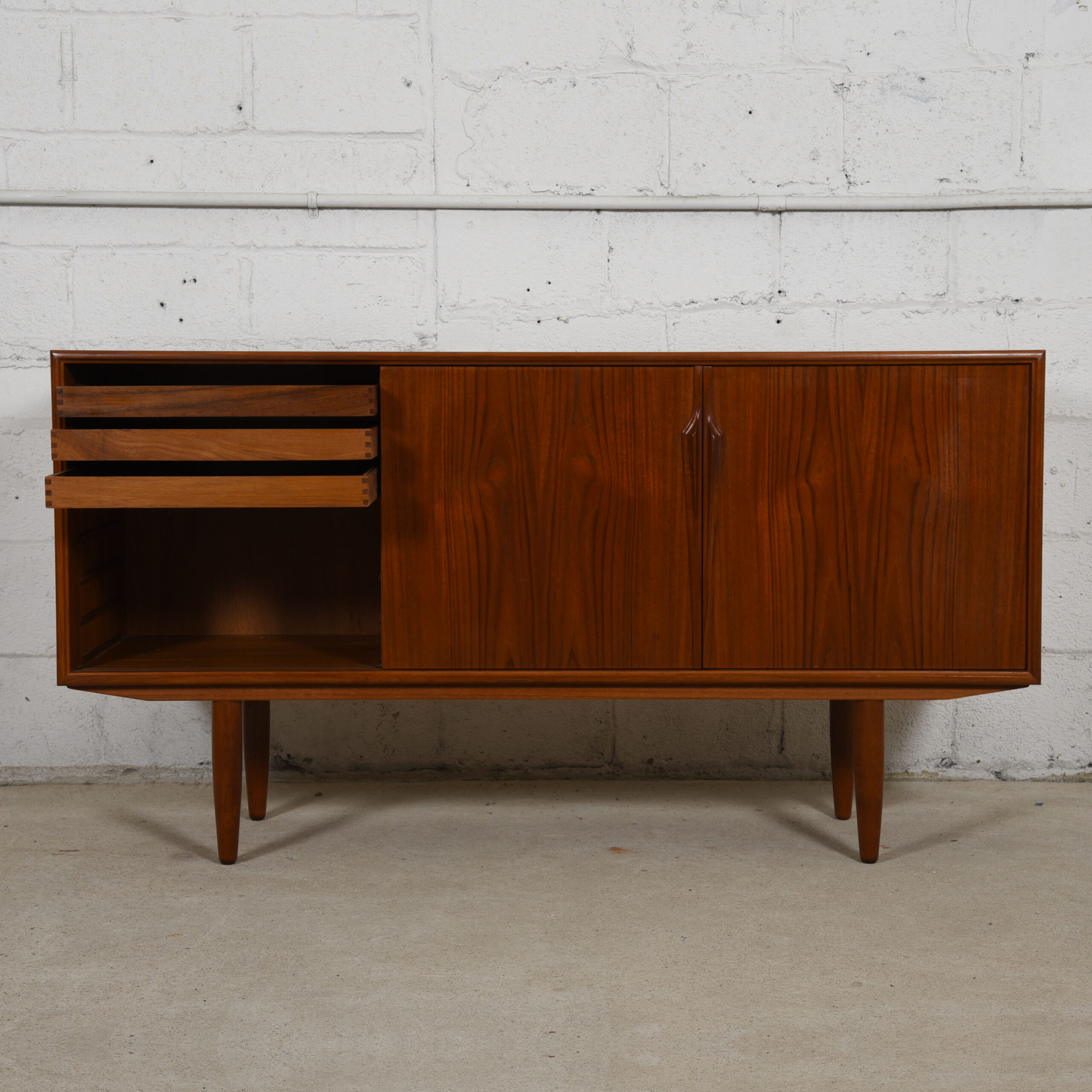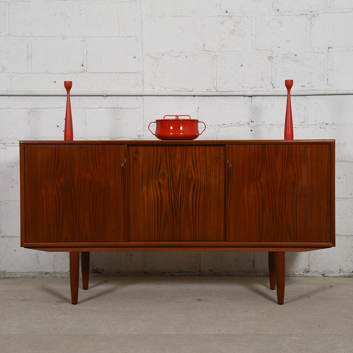 A sculpted Danish Modern teak cabinet designed by Gunni Omann. Three sliding doors, featuring his signature sculpted handles, open to shallow drawers on the left and shelved storage throughout the rest of the piece. Sits on turned teak legs. Mid-sized at 59″, this makes a perfect media cabinet, office credenza or use it as traditionally intended — as a sideboard in the dining room.