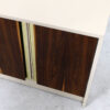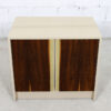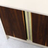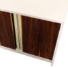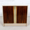 This sophisticated vintage cabinet was designed by Milo Baughman. The two front doors are of beautifully-grained rosewood featuring coppery ‘flames’. The case of the cabinet is lacquered in beige. The colors of the rosewood and lacquer are complemented by brass strips on the edge of the doors, serving also to emphasize the linearity of the piece.
