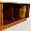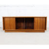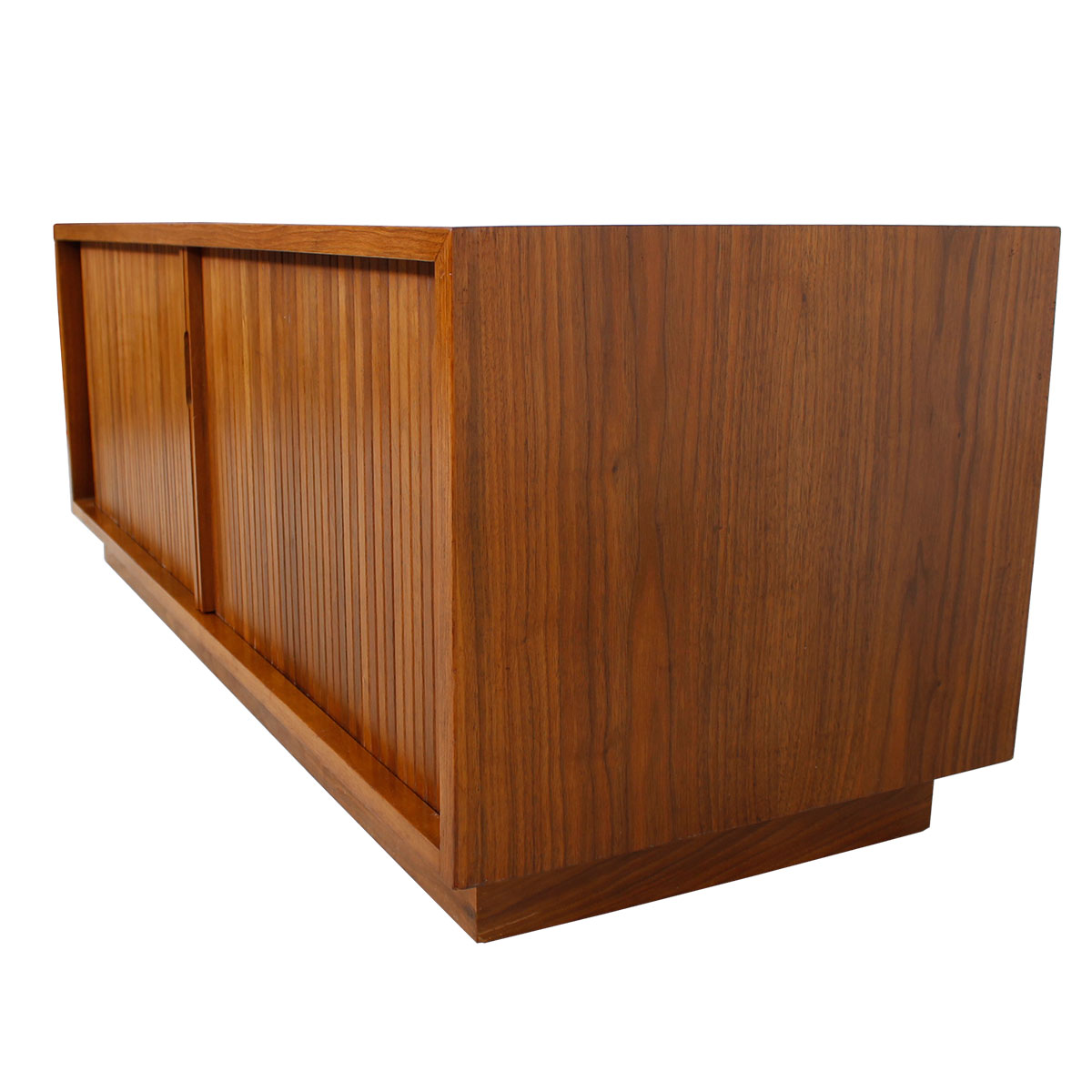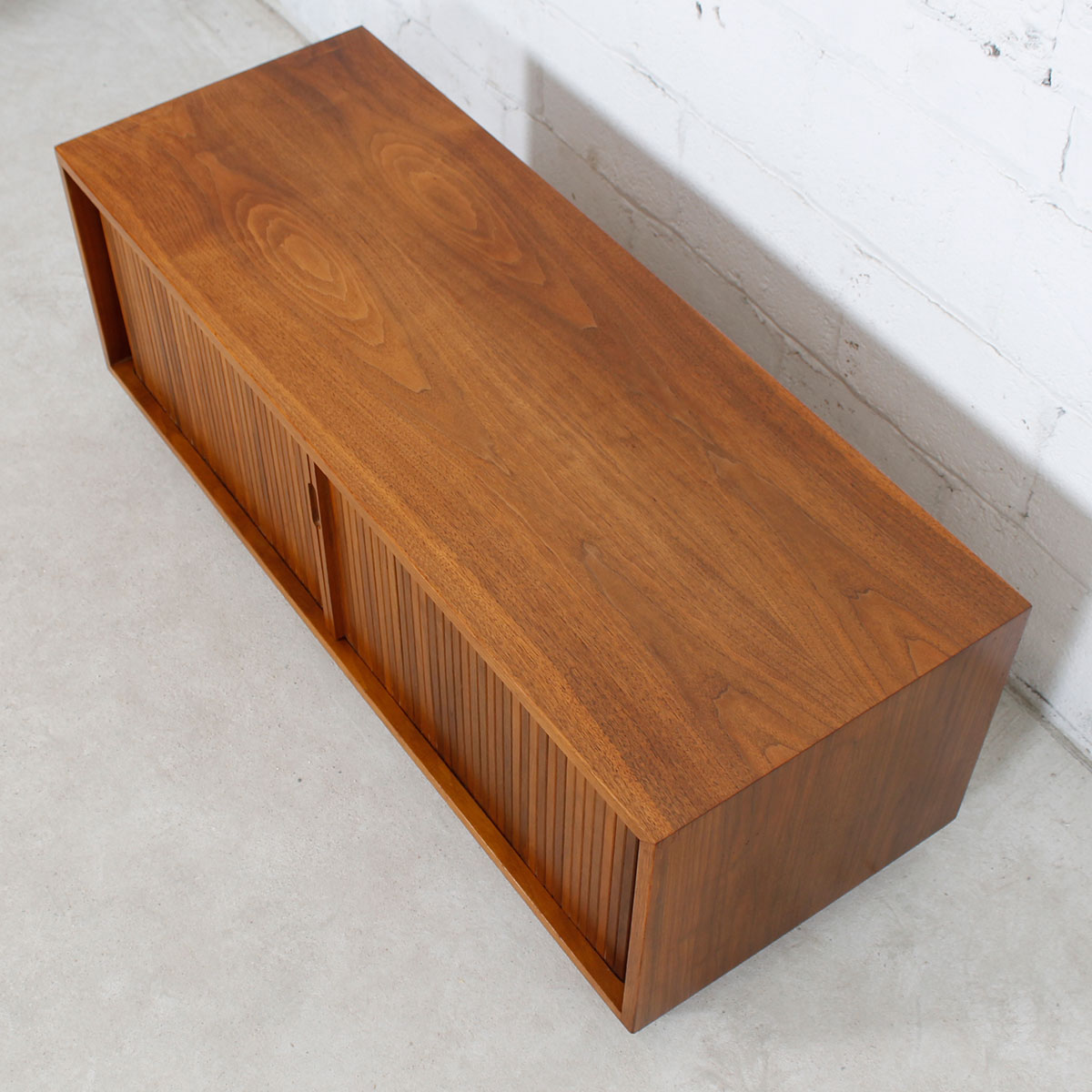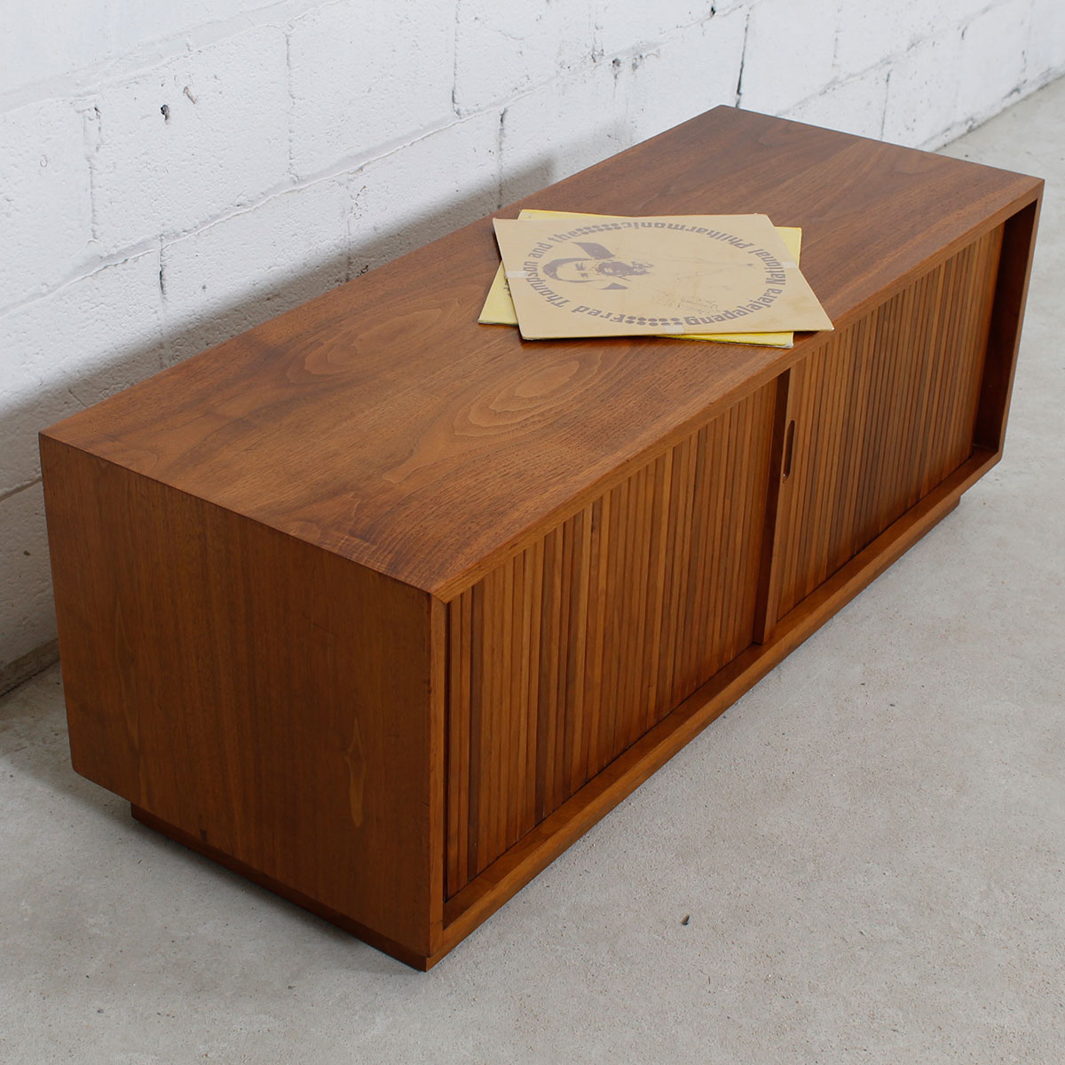 Vinyl is making a comeback and here is an authentic way to store your collection in a piece from the true heyday of recorded albums. This is a designer tambour door cabinet in walnut, designed by Milo Baughman for Glenn of California