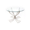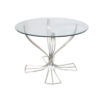 Chrome Table bases rises like a the roots and stem to support the bloom of this flower that is the round top. The chairs have an equal sense of drama as they embrace you, with the chrome slatted back that curves as it descends to the floor to act as a back ‘legs’ for the chairs.