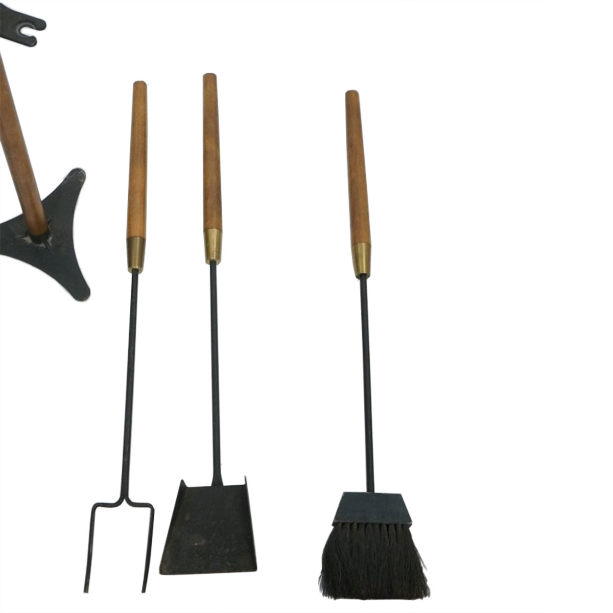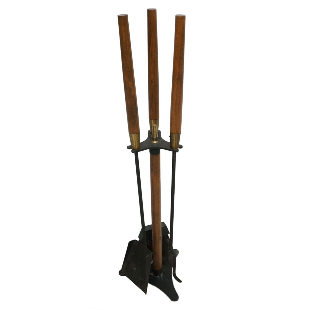 A great modern twist on an old tradition. Portable caddy holds an iron poker, brush and shovel, each with a satisfying round wooden handle accented with brass. The perfect dècor accent for your MCM fireplace.