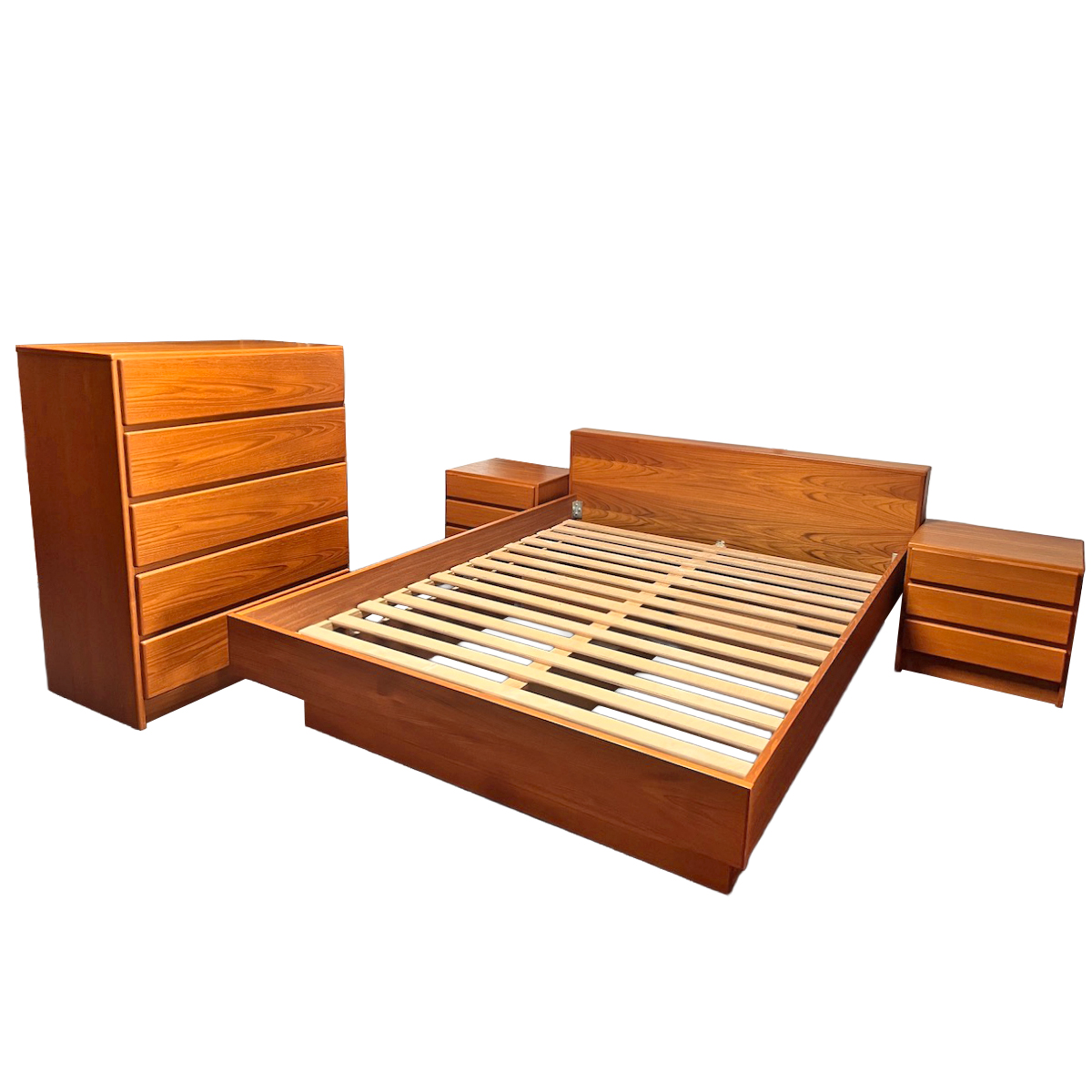 Modernist Teak Queen Bed Ensemble w: Nightstands + Tall Dresser