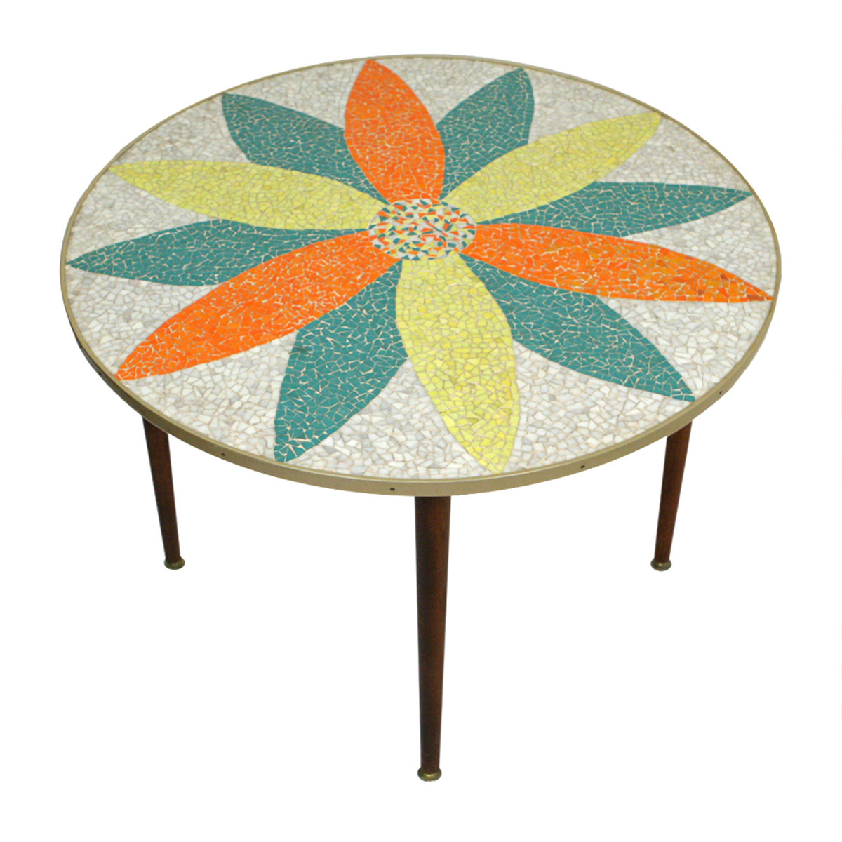 Here we have a round splayed leg table with a Mosaic Tile surface and metal trim. This is perfect as an outdoor patio table or as a dinette & bistro table in your dine-in kitchen! Legs are removable & could easily be converted into a coffee table with a lower set of table legs.