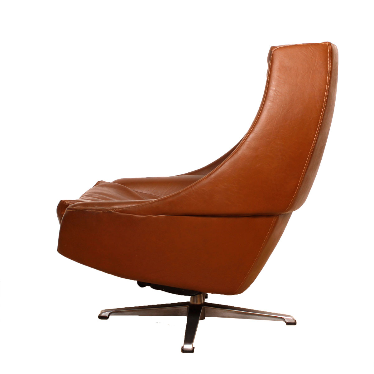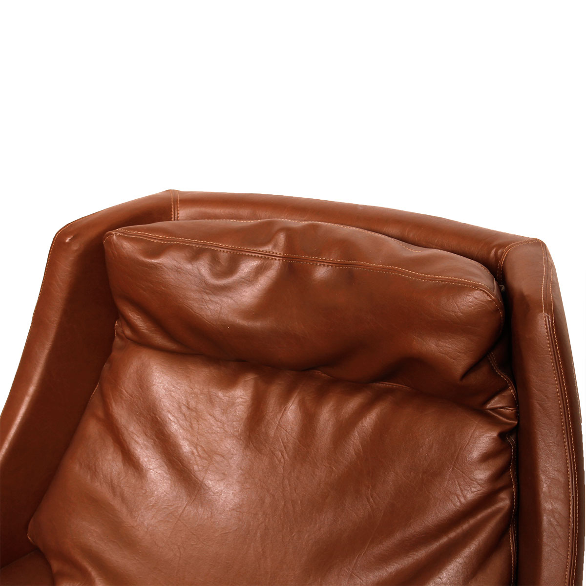 Sit back, put your feet up and take control of your remote in this bold captain’s chair by Overman, just in time for game season. Use the side lever to lock in your reclining position. Simply turn the lever back to release the locking mechanism. Luxuriously upholstered in medium brown pleather, you will celebrate wins and losses in style. Handily swivels so you can reach the snacks while you’re watching. Excellent condition!