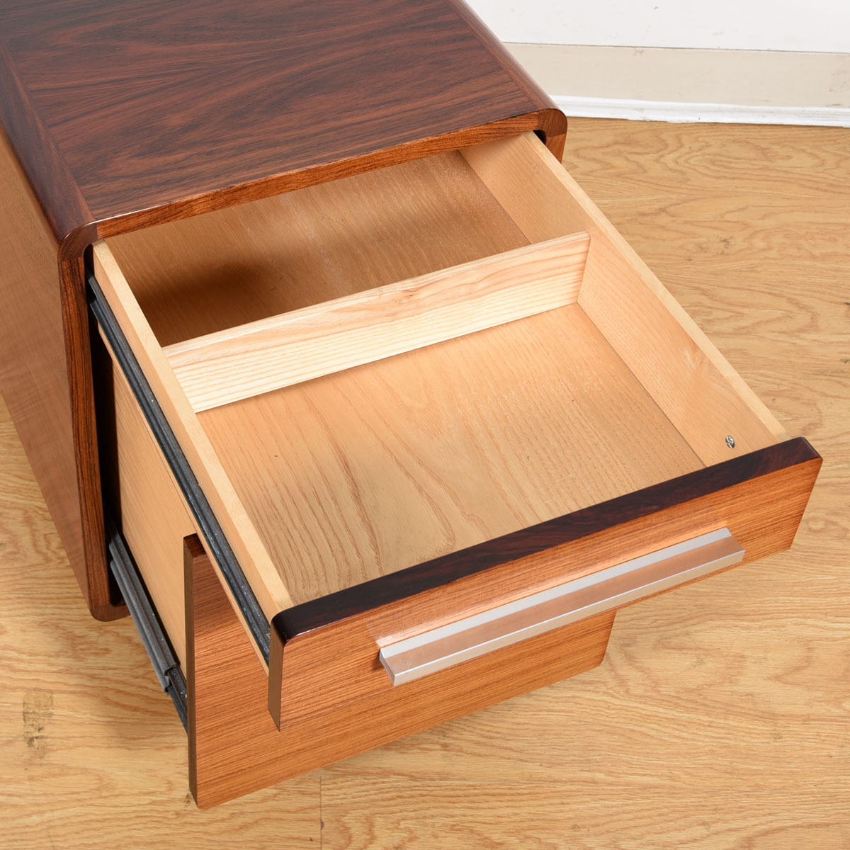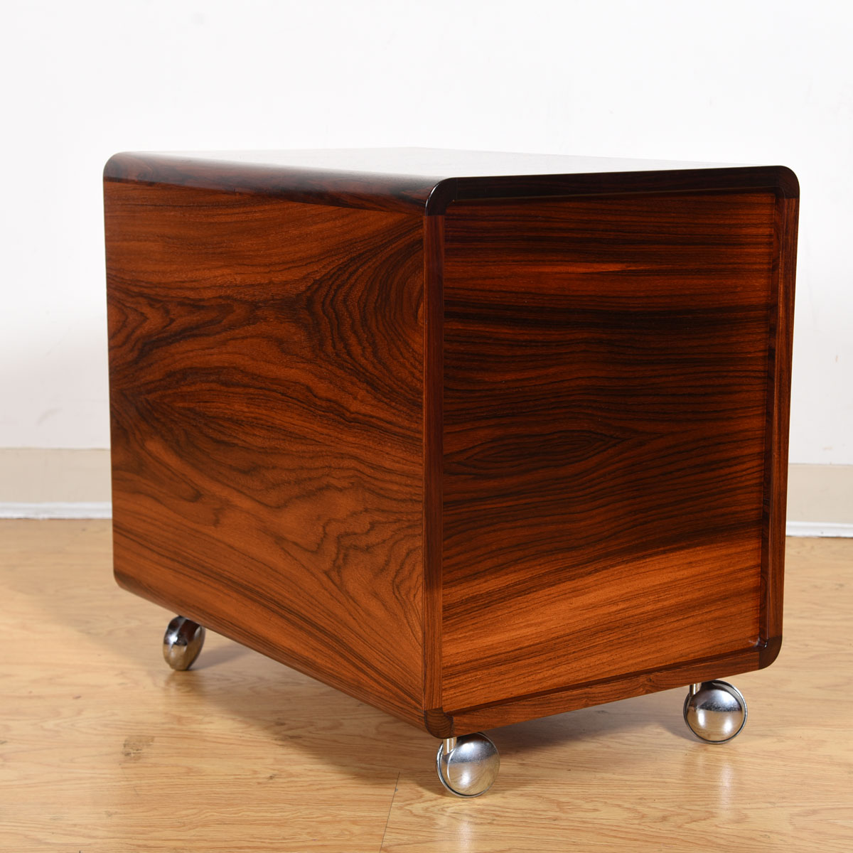 - Chrome pulls are a counterpoint to the gorgeous rosewood