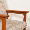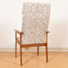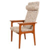 Unusal pair of Danish Modern tallback easy chairs. Teak frame supports a fully upholstered seat and back. The back has a removable headrest.