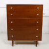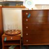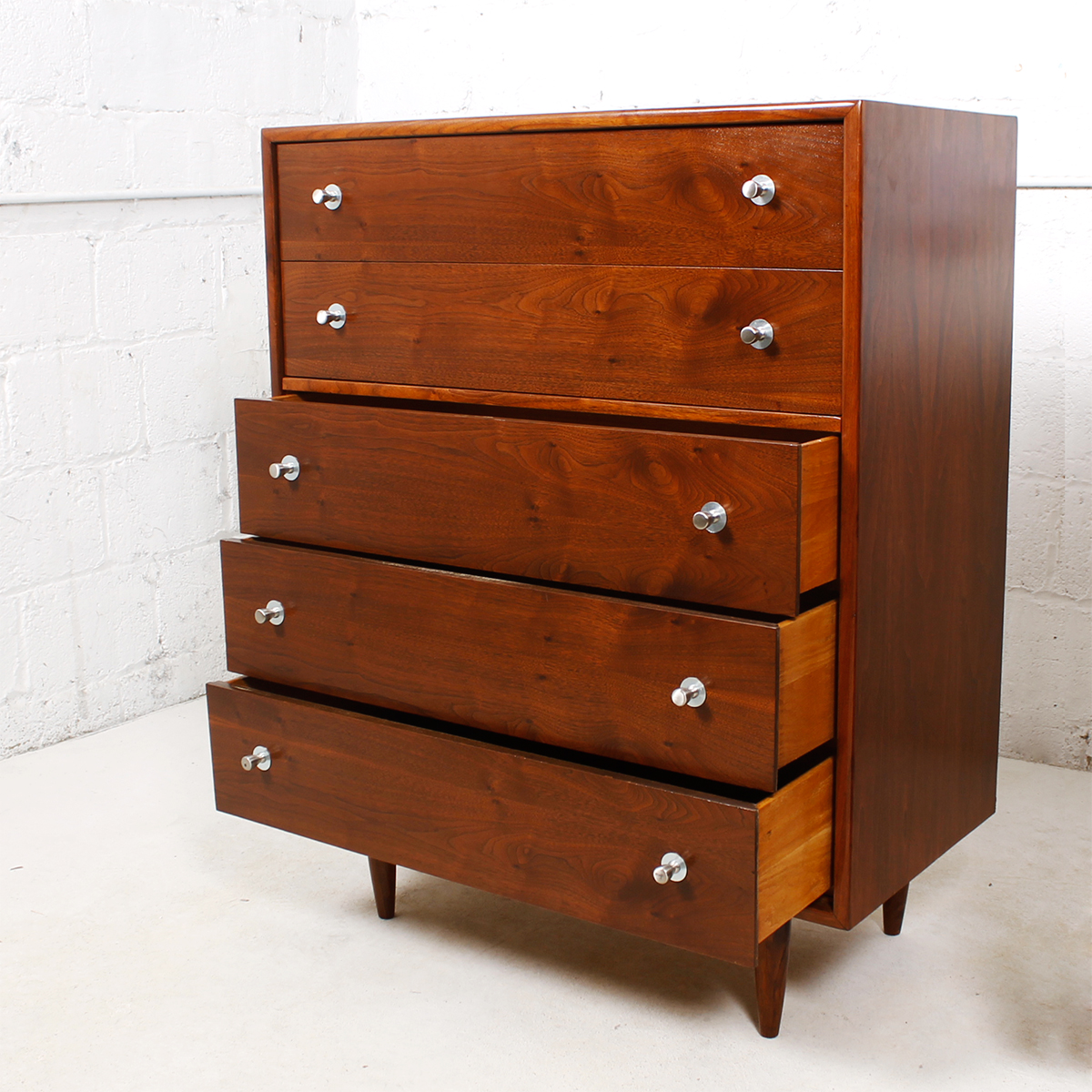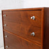 This walnut thin-edge dresser is utterly gorgeous. Dating to the 1960’s, it has aged to a richly toned shade of brown. Each of the five drawers on the dressers has two chrome pulls in the signature shape of George Nelson. The dresser is nicely sized as well – not too large, not too small. The front is broken up subtly by a slight demarcation between the upper two drawers and the lower three, so the dressers are not blocky.