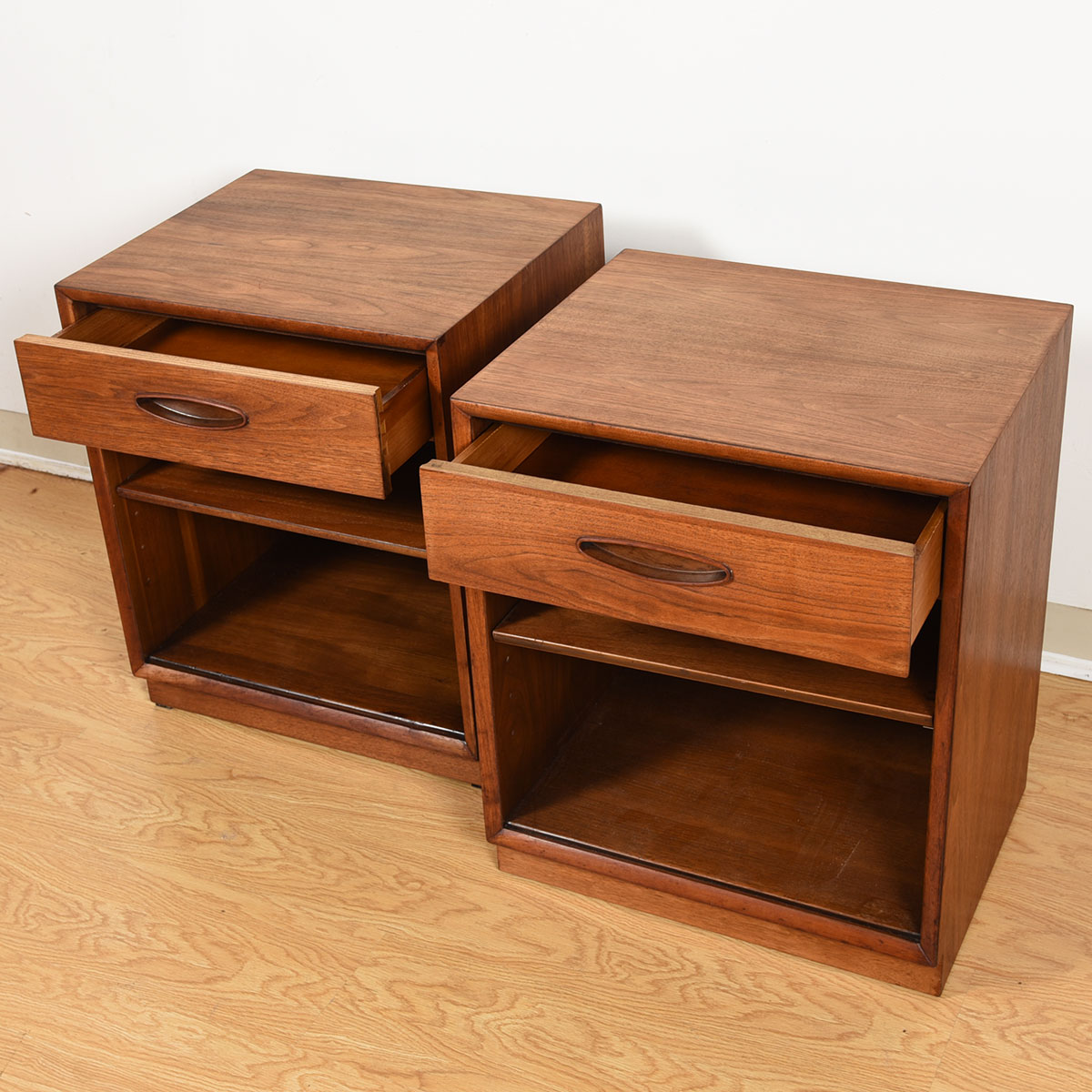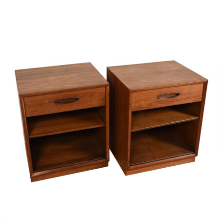 This gorgeous pair of American-made walnut nightstands has a strong Danish appearance with the sculpted oval drawer pulls. Each nightstand also has an adjustable shelf and a cubby space. The walnut has achieved a glorious patina of age.