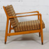 This rare find is a pair of early Swedish Modern lounge chairs with a matching ottoman, attributed to Dux. All are upholstered in their original fabric, which is neutral tones touches of yellow.