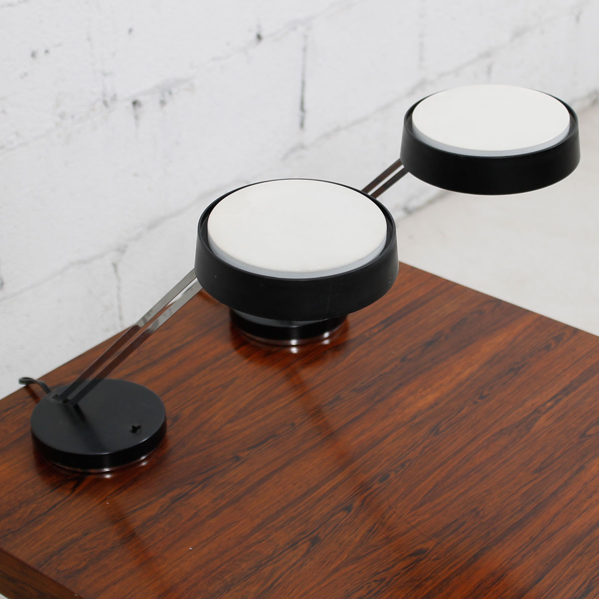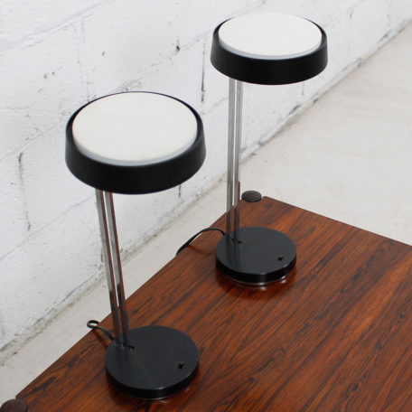 To arrange purchase or for more information about the Pair of Adjustable Height ‘Leaning’ Mid Century Chrome White + Black Desk Lamps please call us at 202.882.1648 or email us at info@modernmobler.com