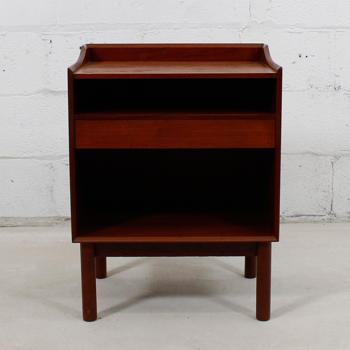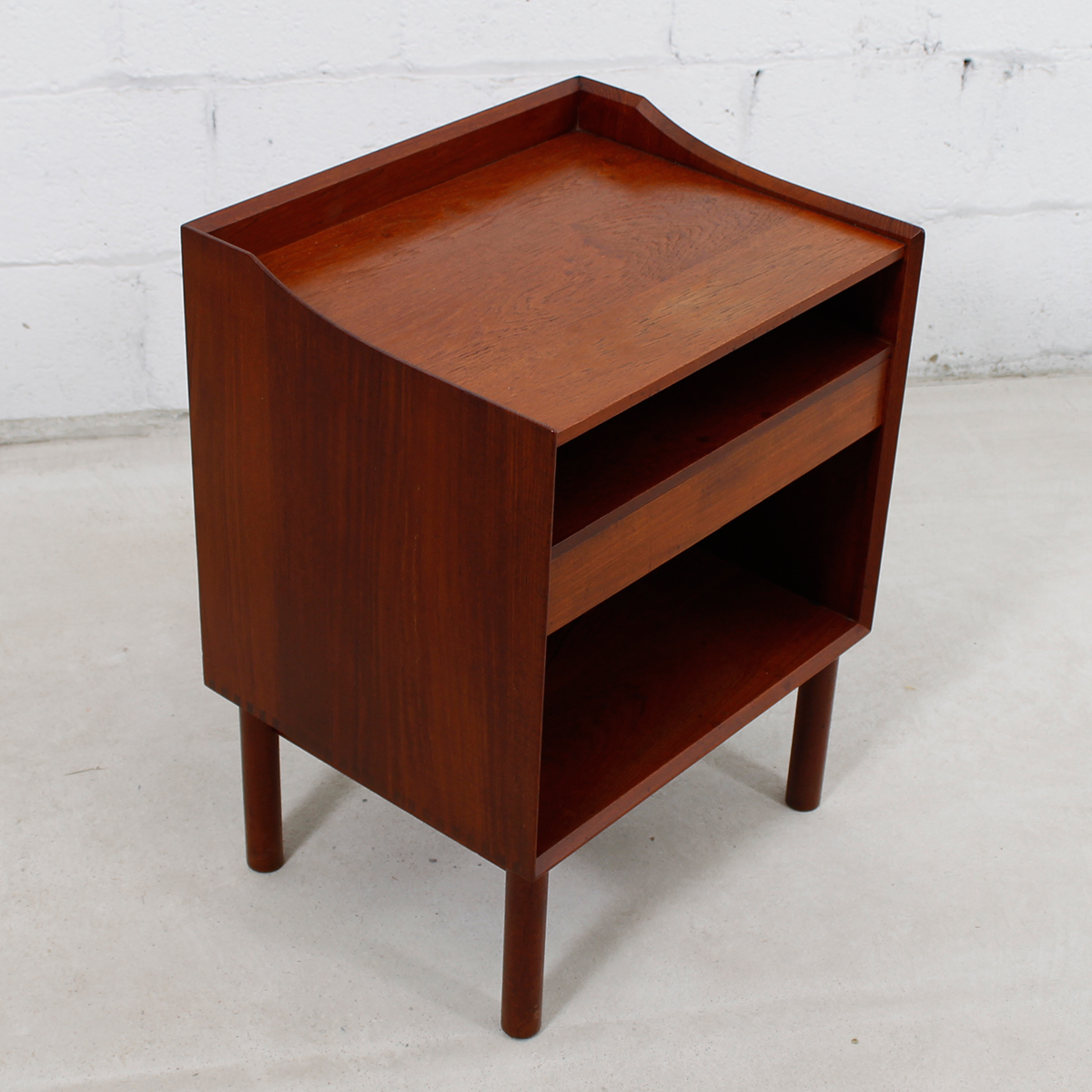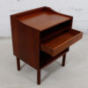 This is an incredible pair of solid teak Danish Modern nightstands or end tables designed by Peter Hvidt. Sitting on turned legs, the open “box” of the nightstand has one shallow drawer slightly off-center, with shelf space above and below.