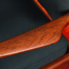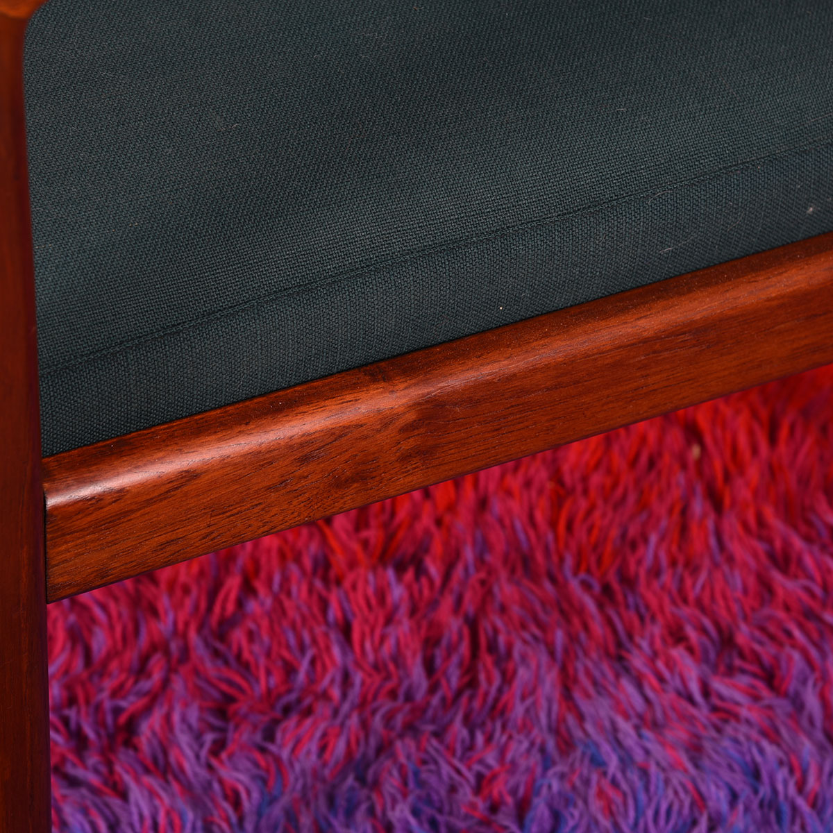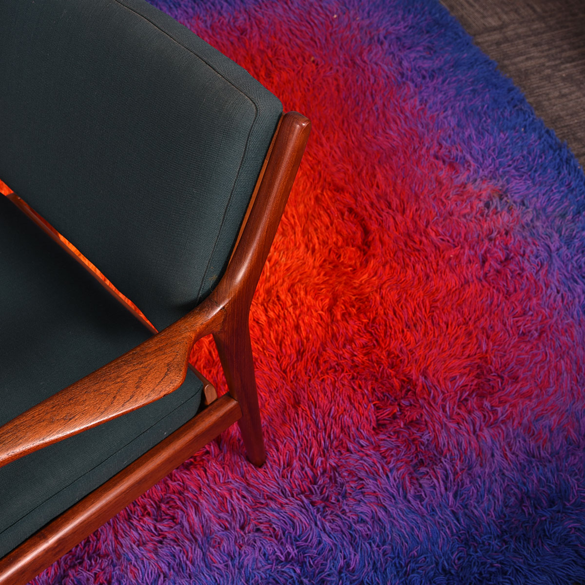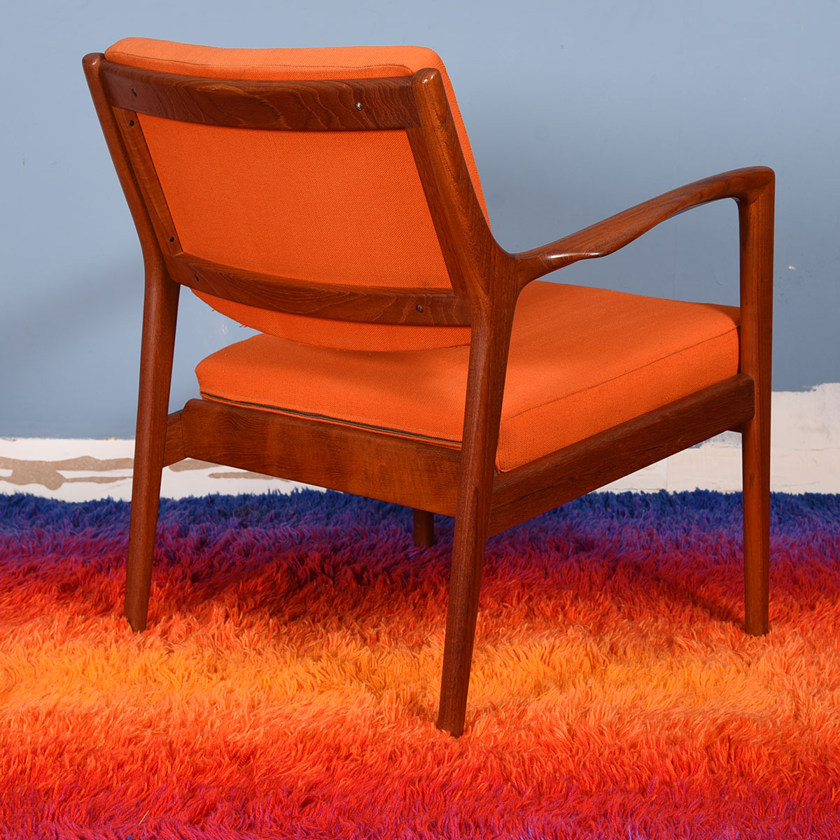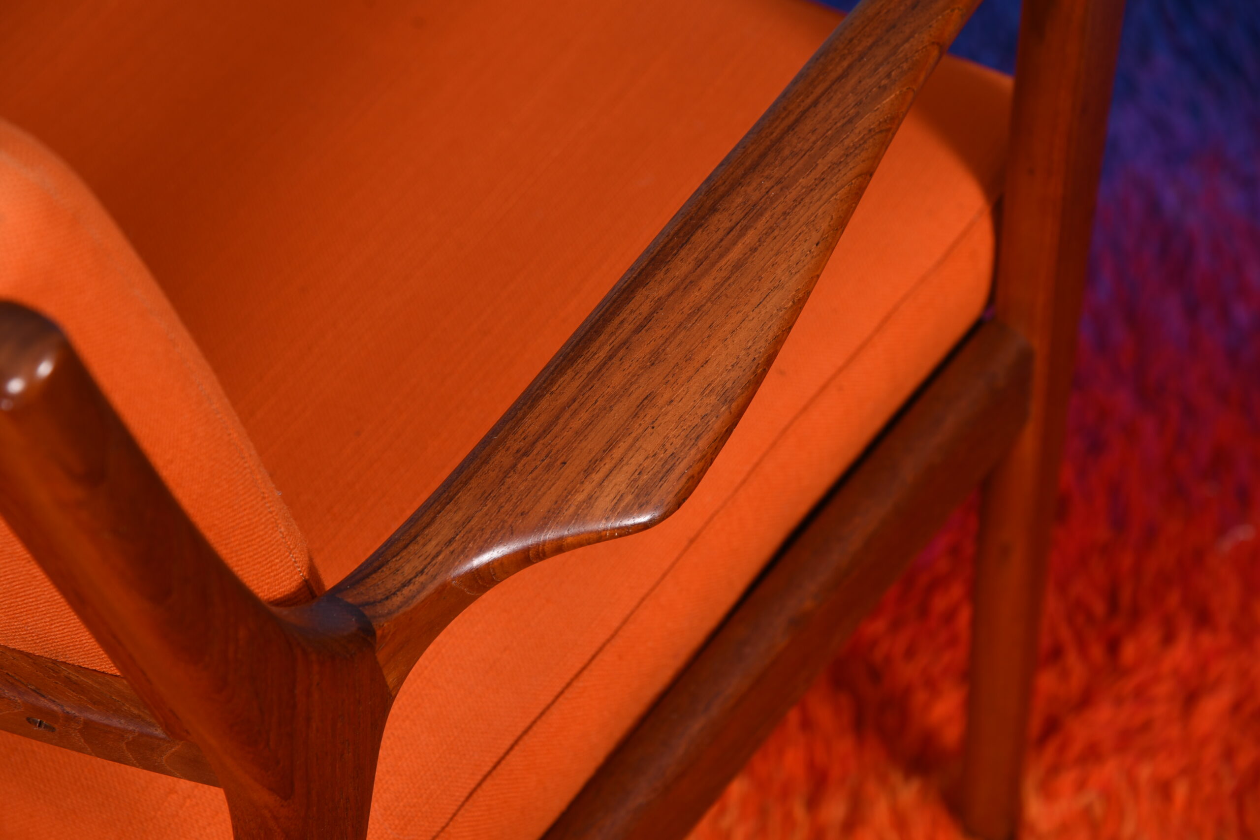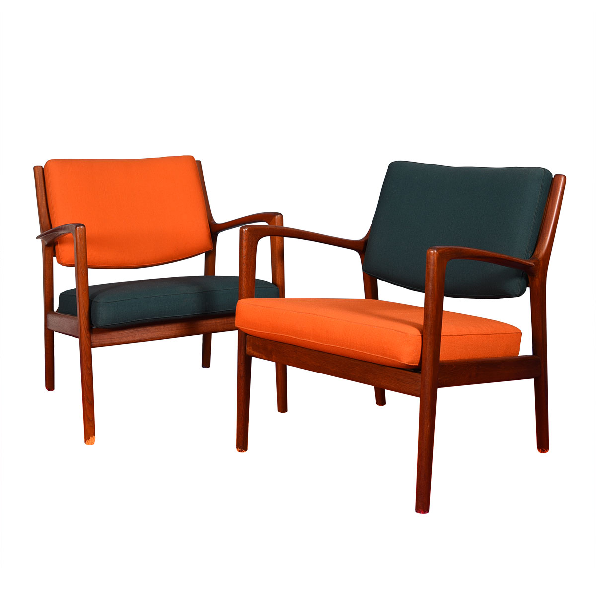 Gorgeous pair of Danish Modern lounge chairs with a teak frame. The shape of the arms is particularly striking. These chairs also have their original upholstery in bright orange and peacock blue. A fixed cushion is on the backrest, while the seat cushion can be interchanged between the chairs. Super comfortable, these chairs are neither too upright or too far back providing a relaxing experience.