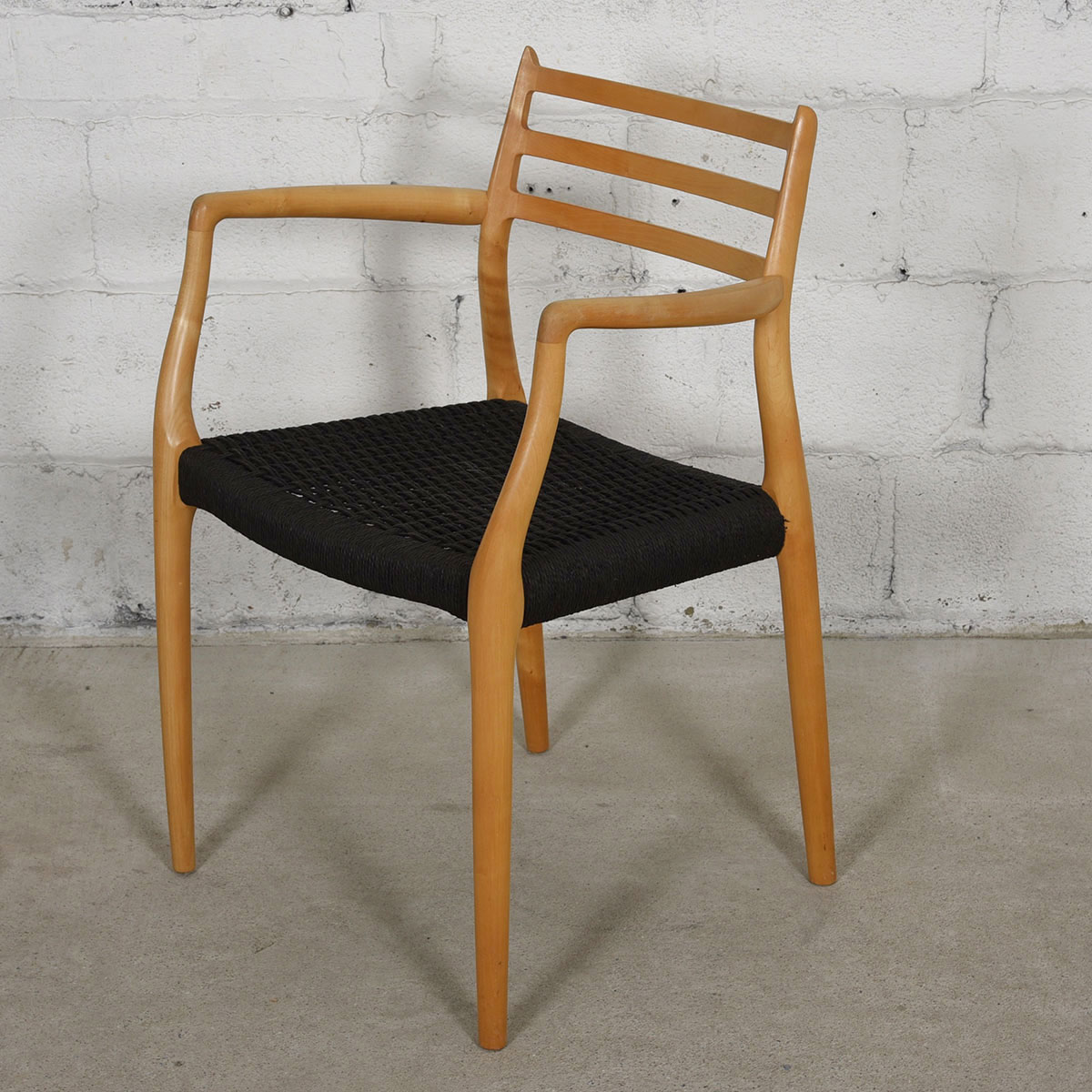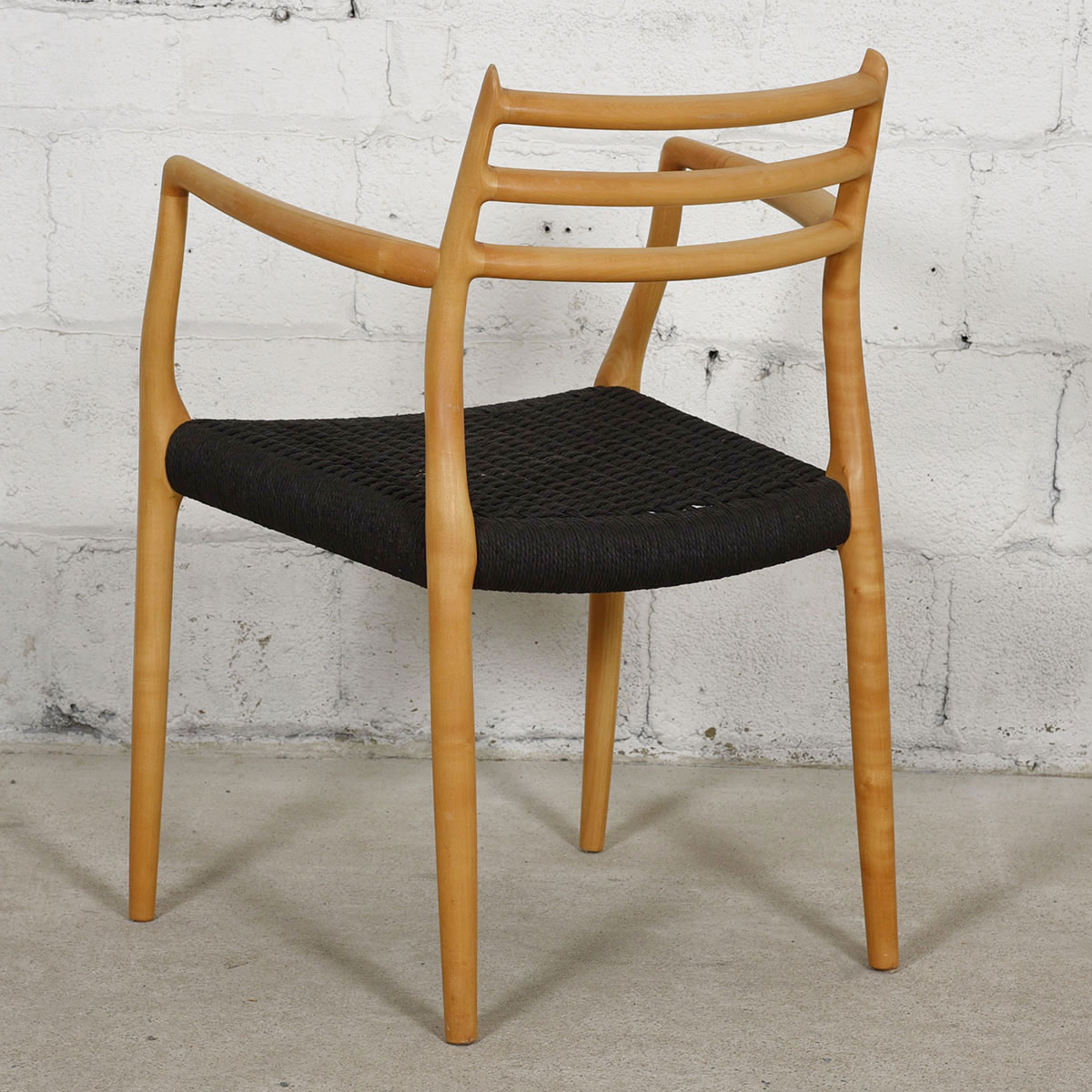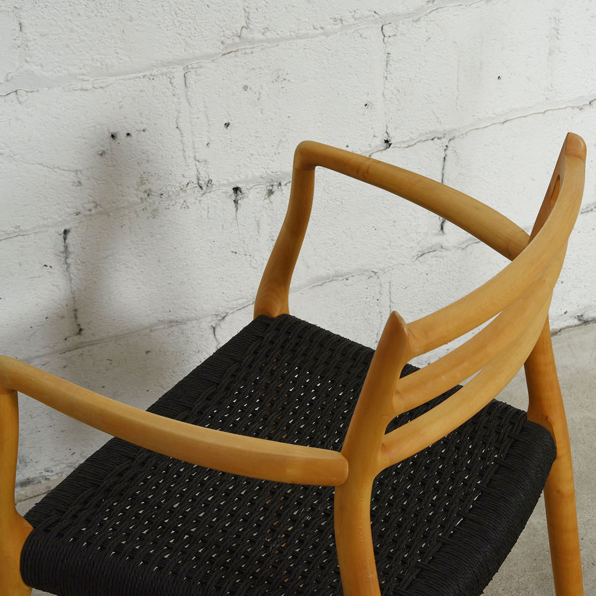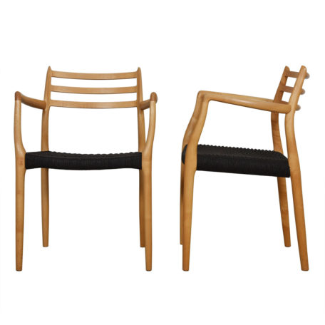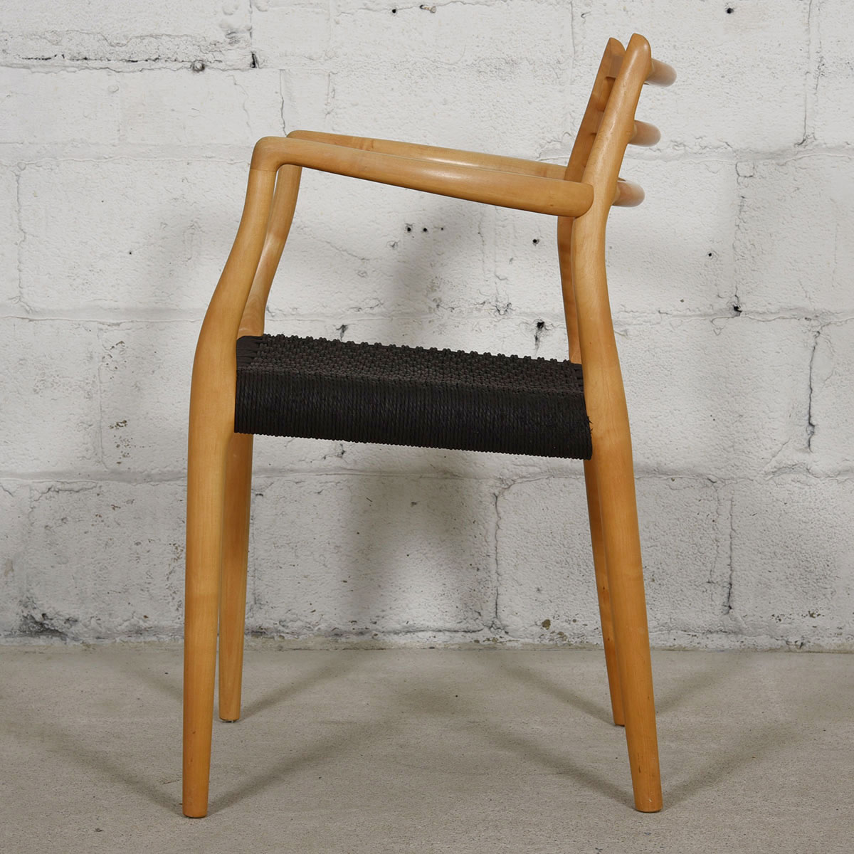 This is a pair of Danish Modern armchairs by Niels Moller, known as the Model #62. This chair is characterized by the three horizontal bands across the top of the back, and the little “horns” on each top end. The shape of the leg blending into the armrest is simply beautiful. This pair is beech, a light wood, which makes the nuances of the design seem to stand out. The black corded seats provide for a dramatic contrast. Use these in a room for extra seating and bring to the table when needed.