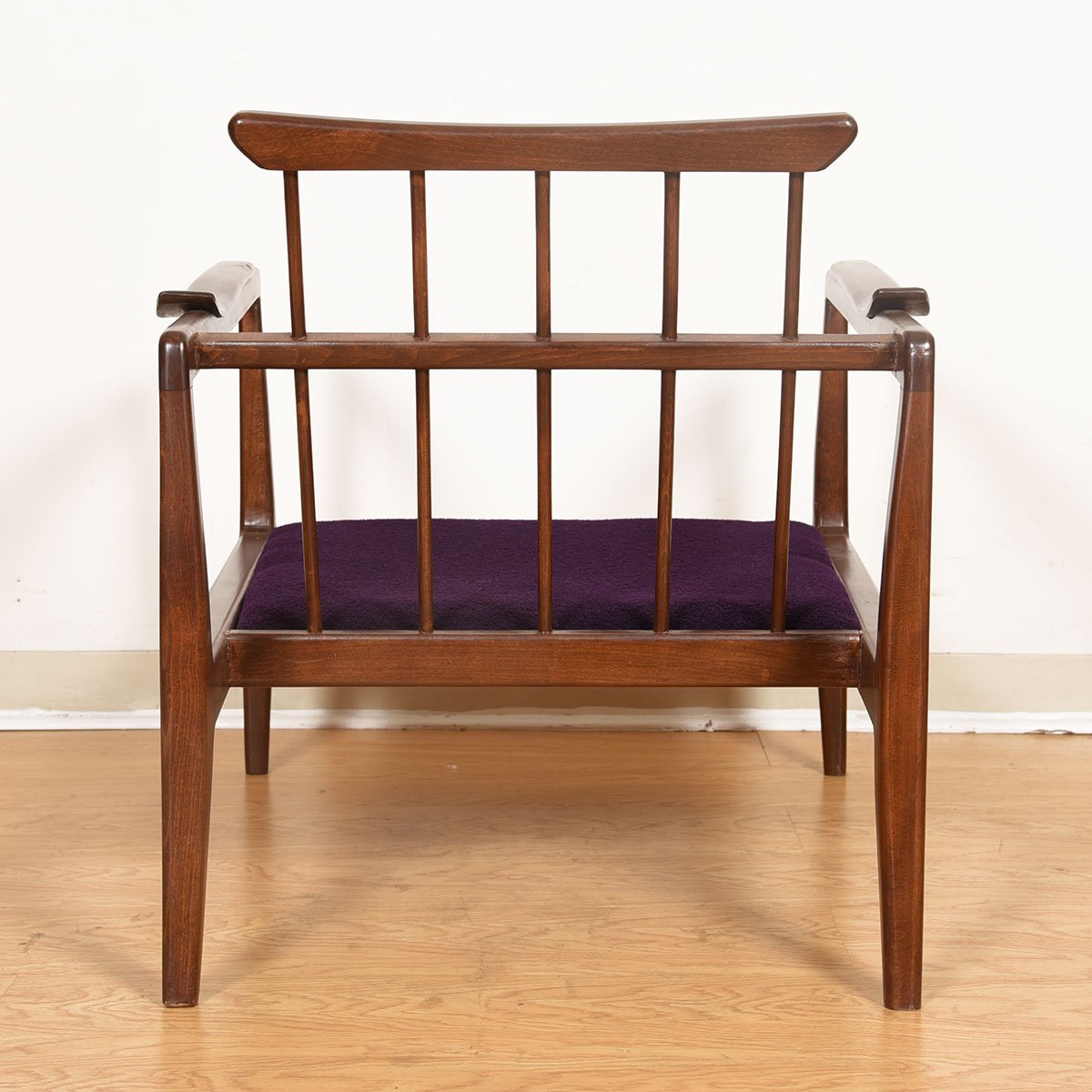 The back is comprised of vertical and horizontal lines. These chairs are very comfortable and lovely from any angle. The two cushions are upholstered in a luscious eggplant-toned fabric.