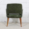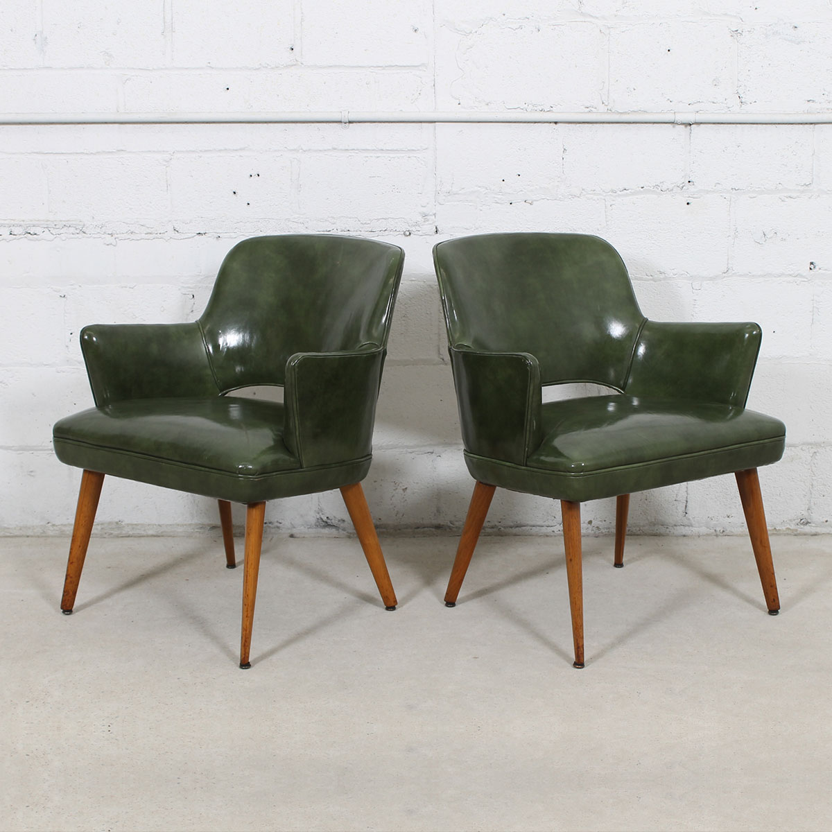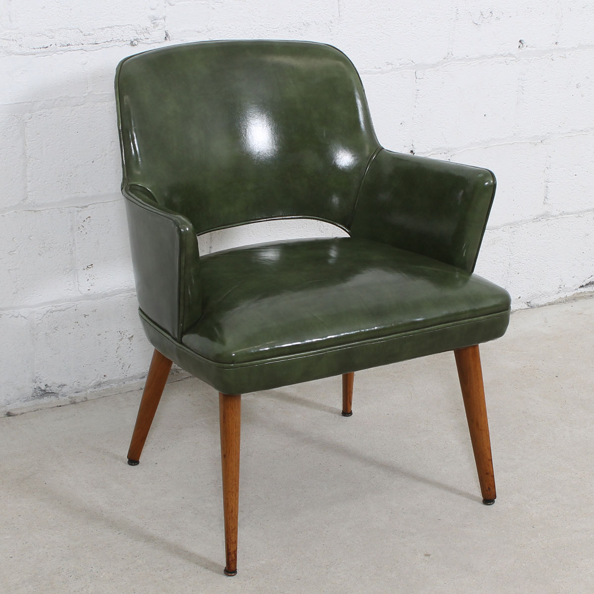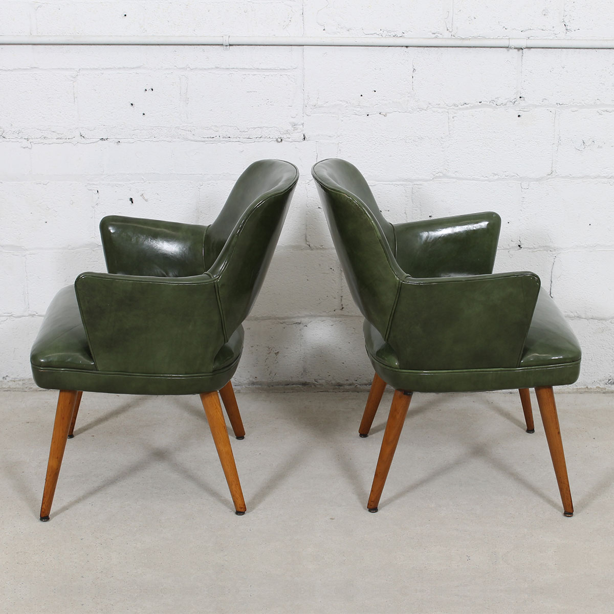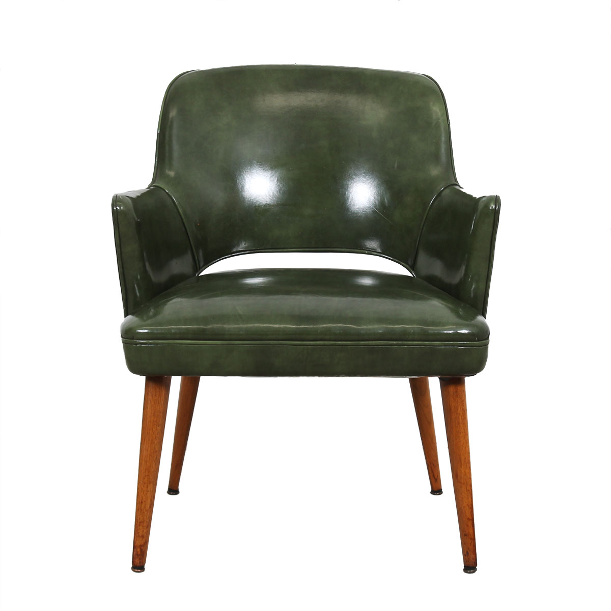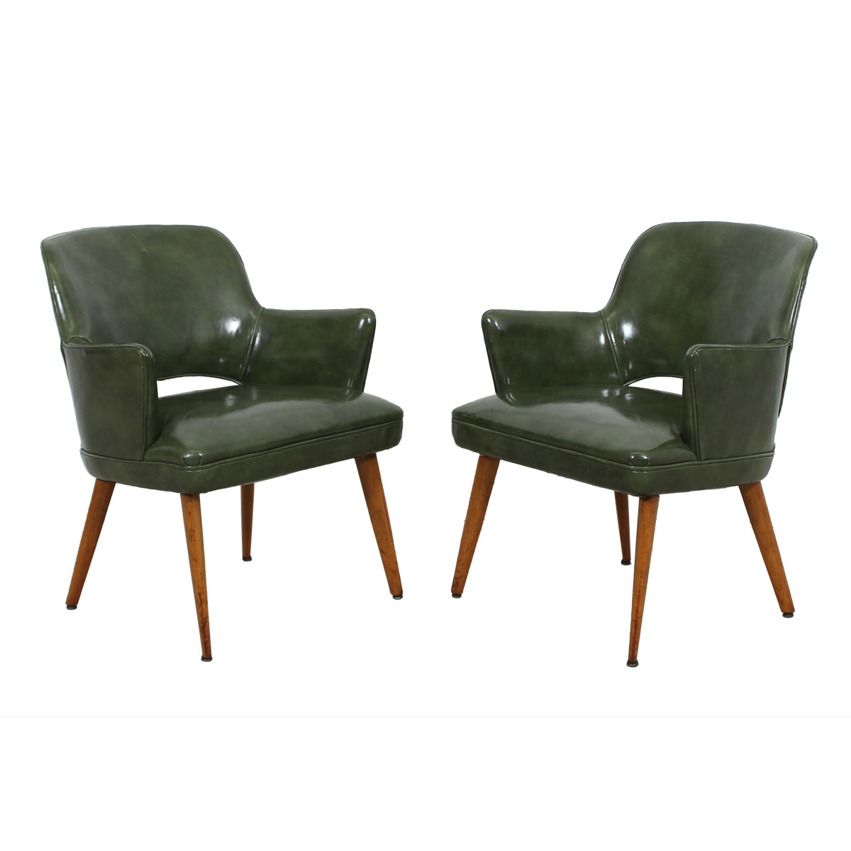 These chairs retain their original upholstery, a beautiful medium green color. The exciting style of these chairs will add flair to your home or office.