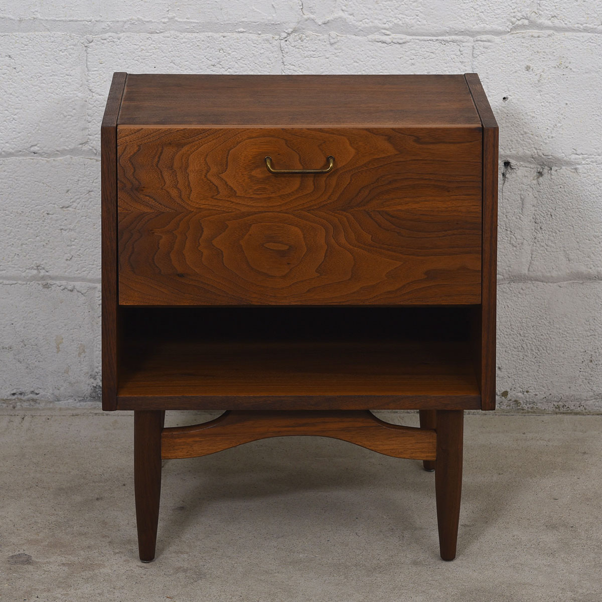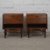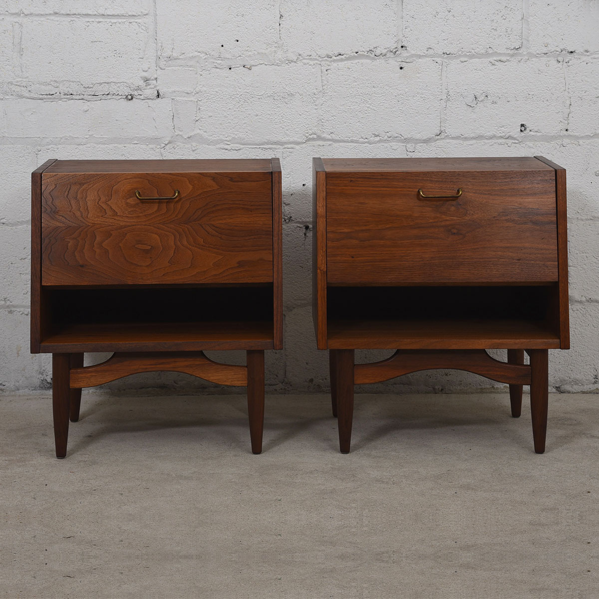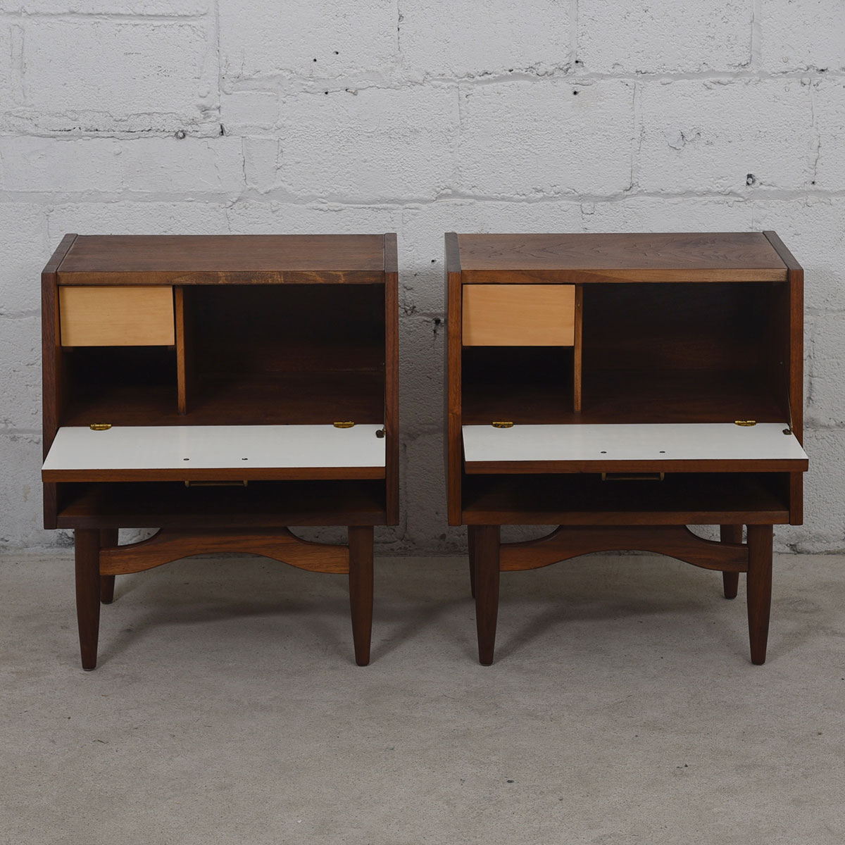 This handsome pair of mid century nightstands or end tables comes from respected American manufacturer American of Martinsville, circa late ’50s early ’60s. The walnut on these is stunning.
