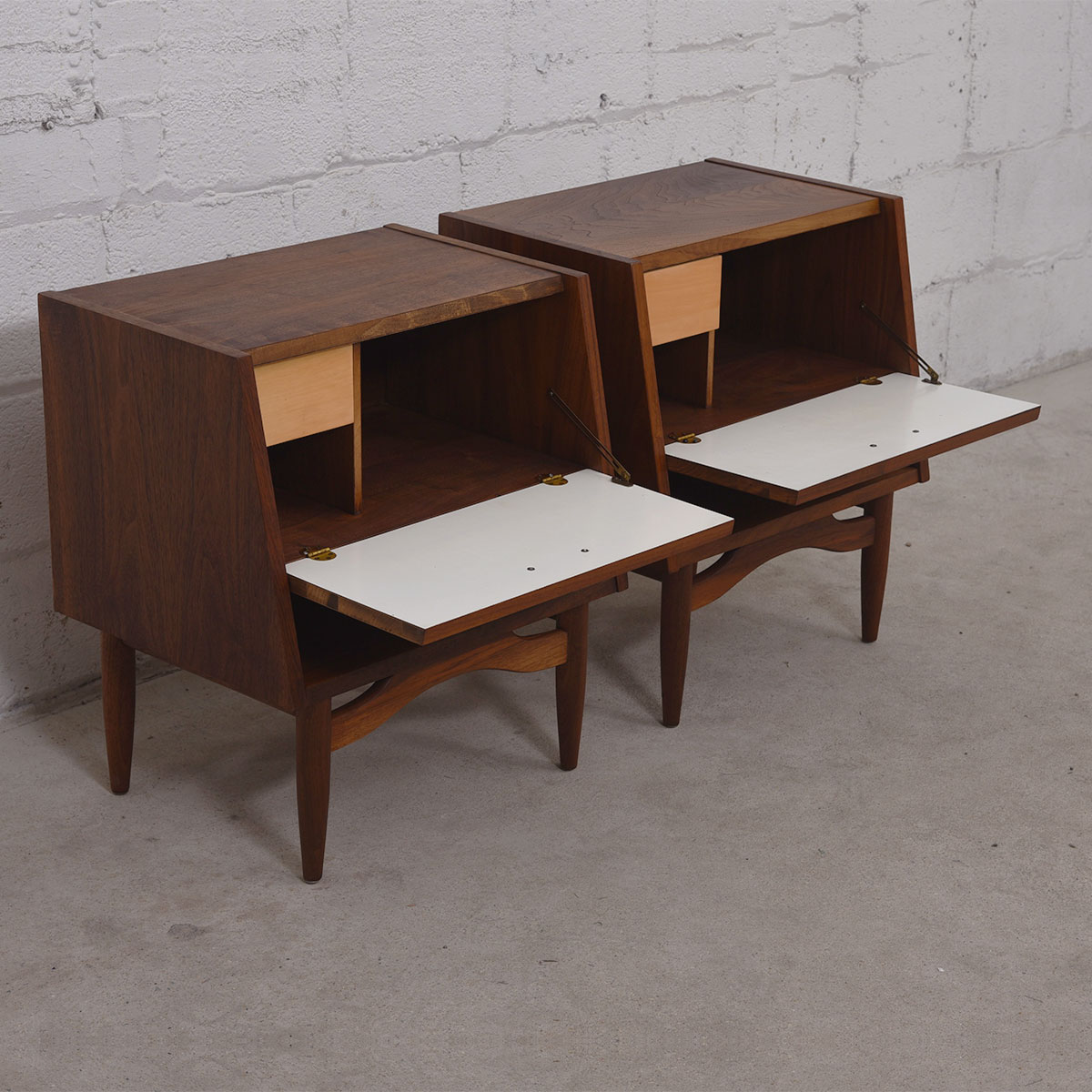 To arrange purchase or for more information about the Pair of Mid Century Walnut Slanted Front Nightstands / End Tables please call us at 202.882.1648 or email us at info@modernmobler.com