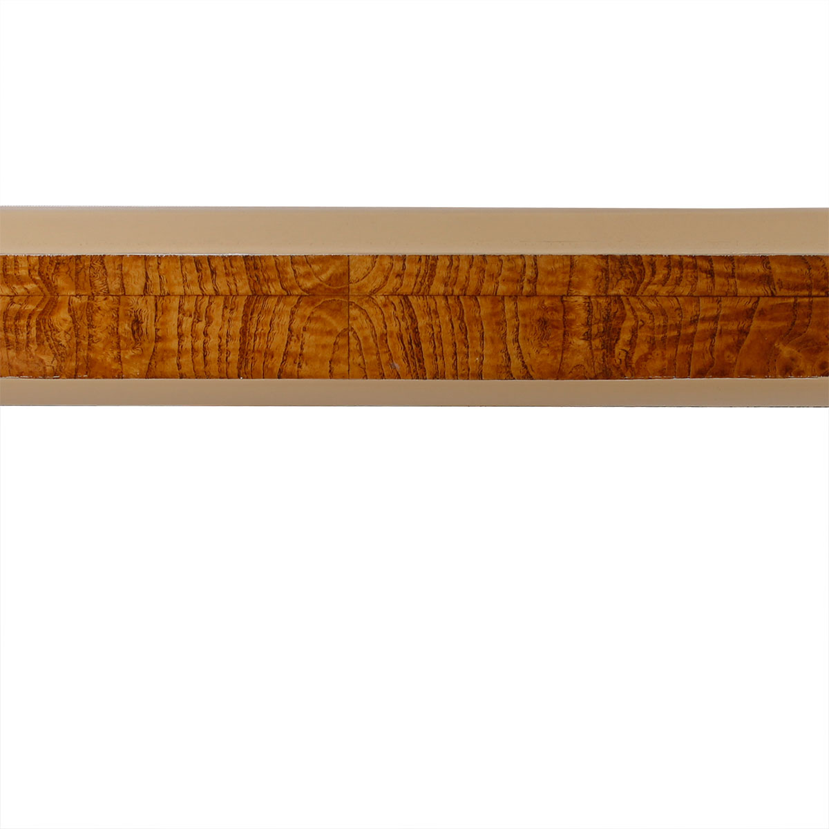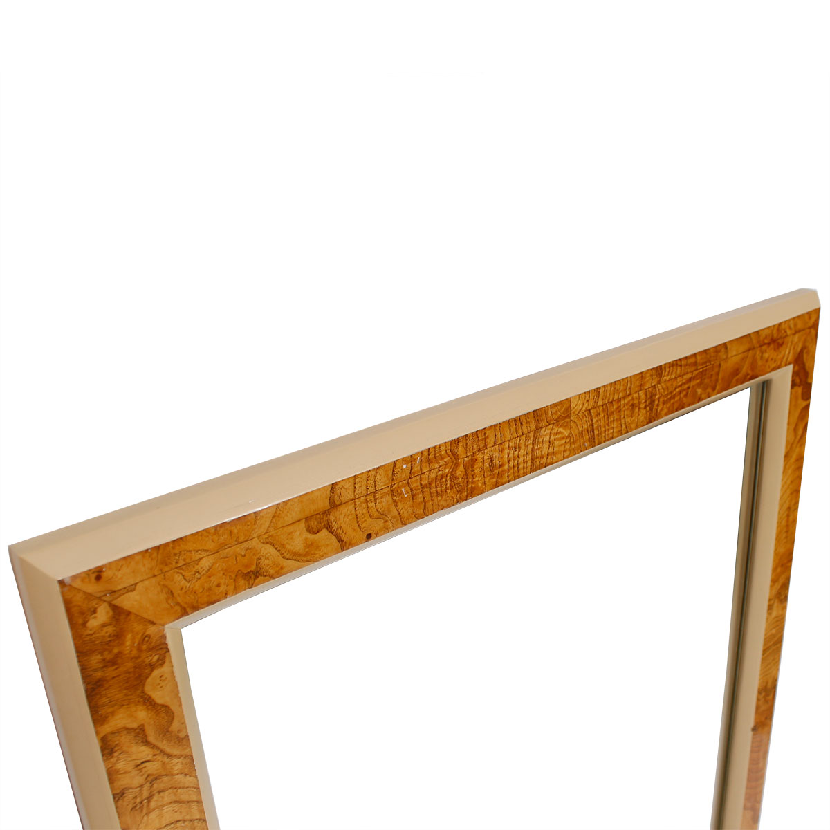 A band of burled wood inlay highlights the almond colored frame all the way around, defining the space of the mirror and making a statement!