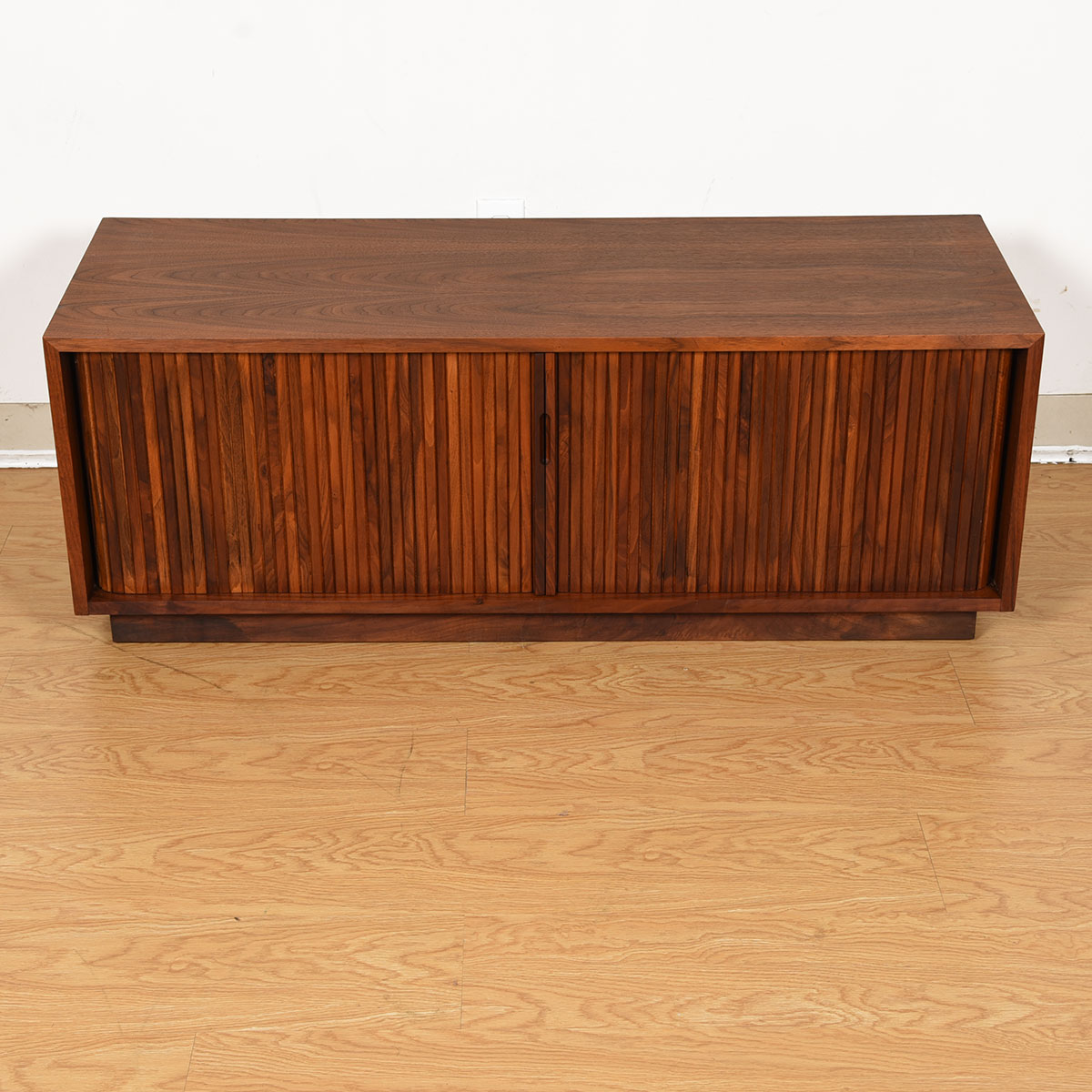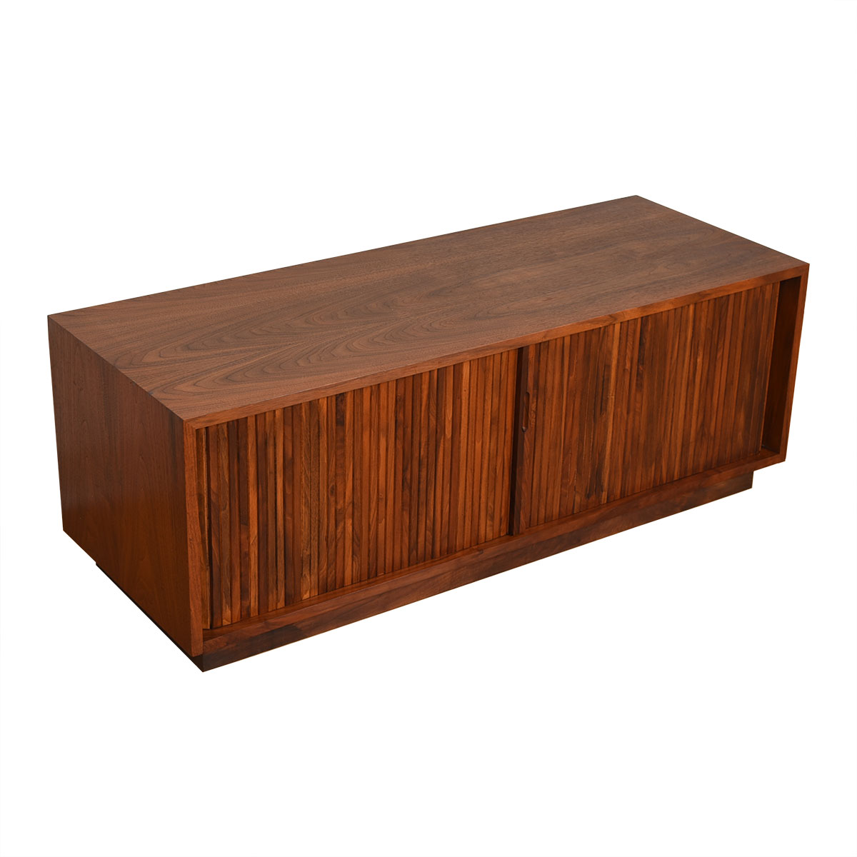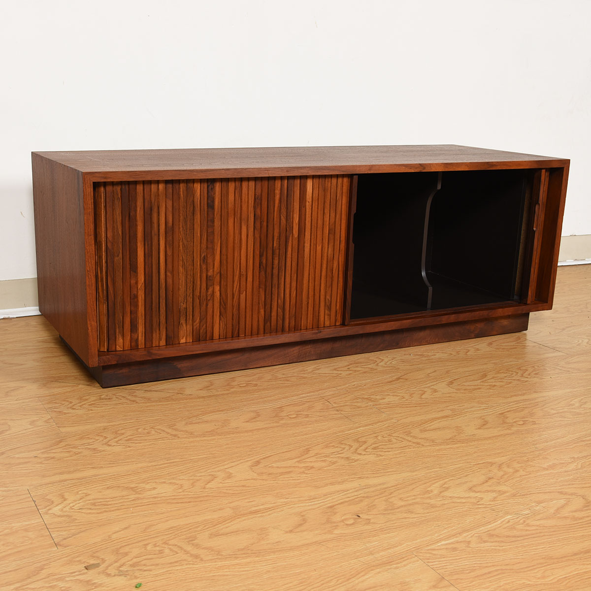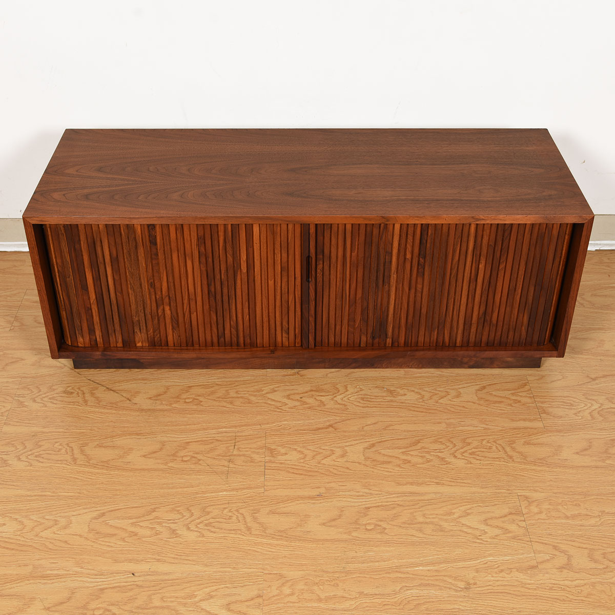 Vinyl is making a comeback and here is an authentic way to store your collection in a piece from the true heyday of recorded albums. These are designer tambour door cabinets in walnut, designed by Milo Baughman for Glenn of California.