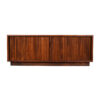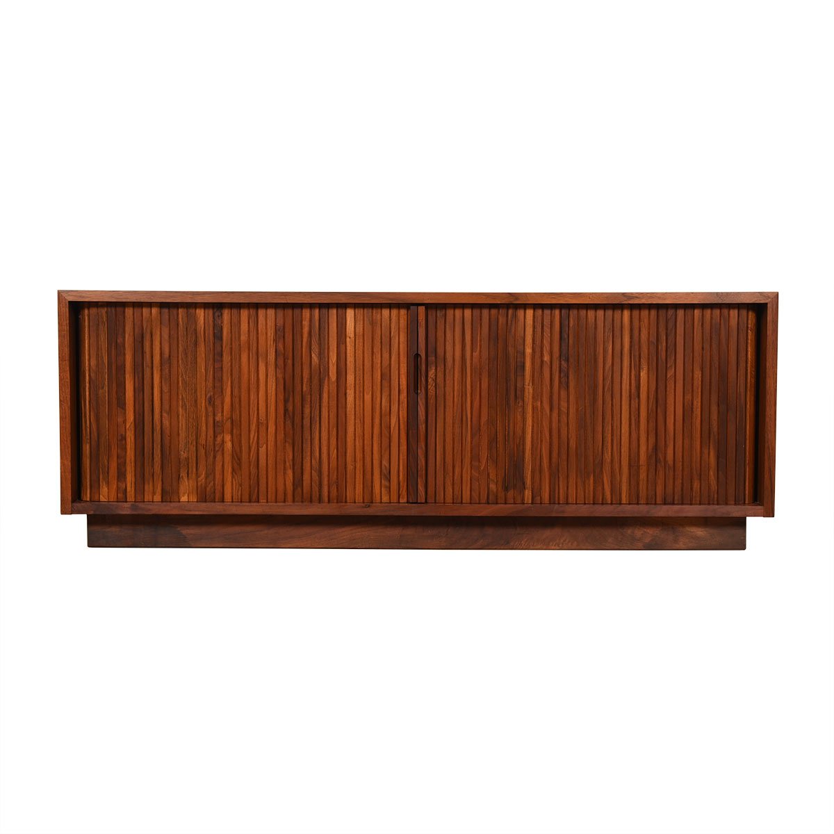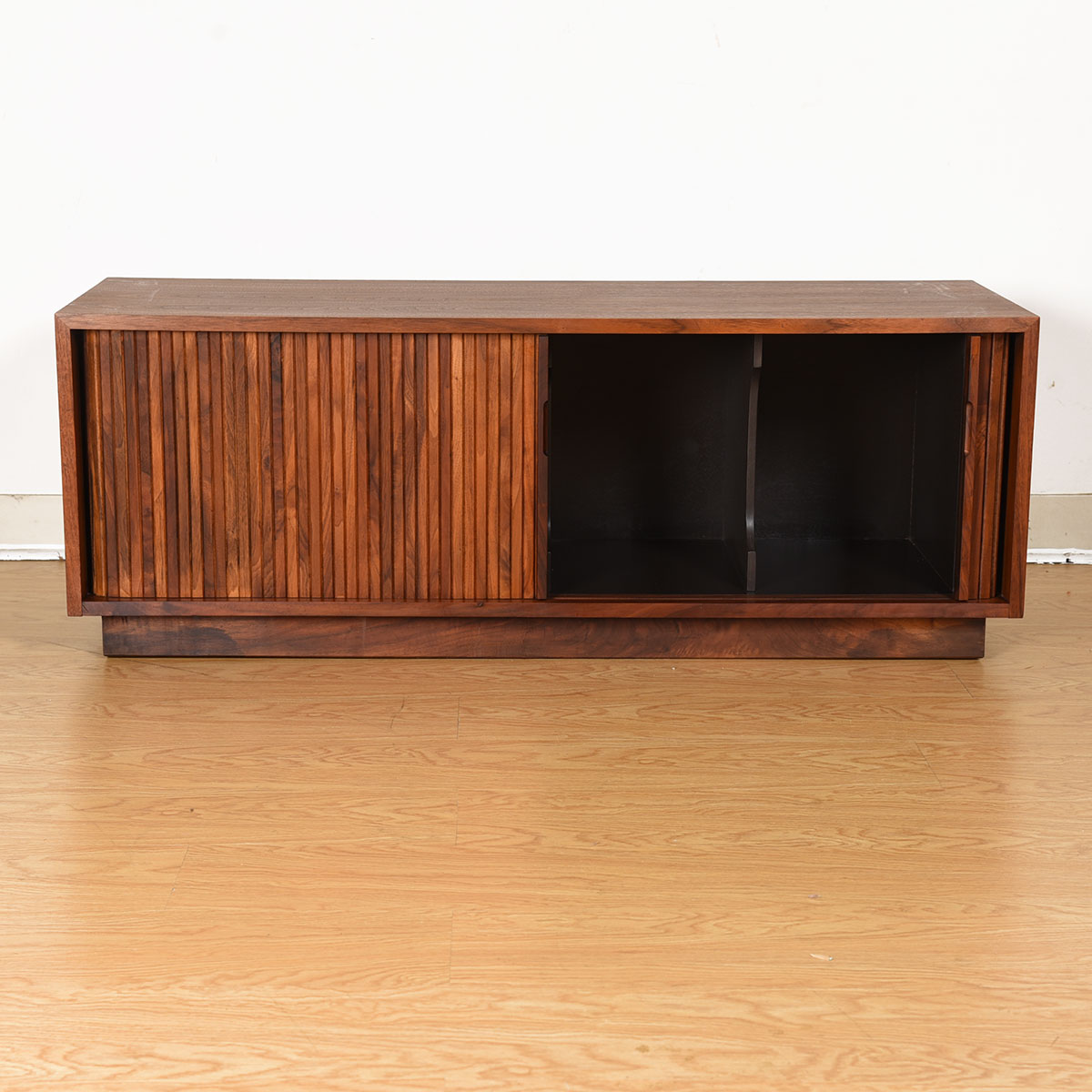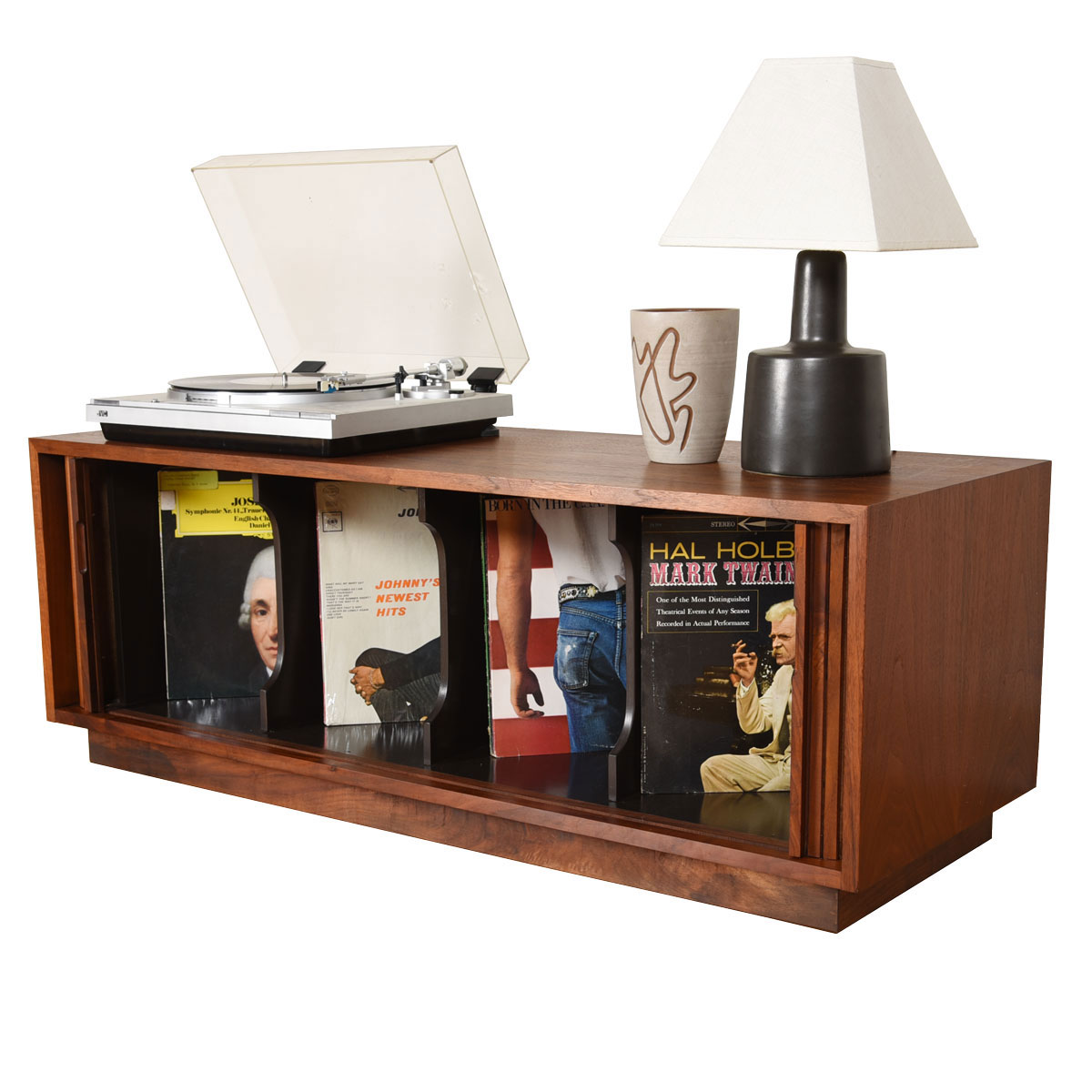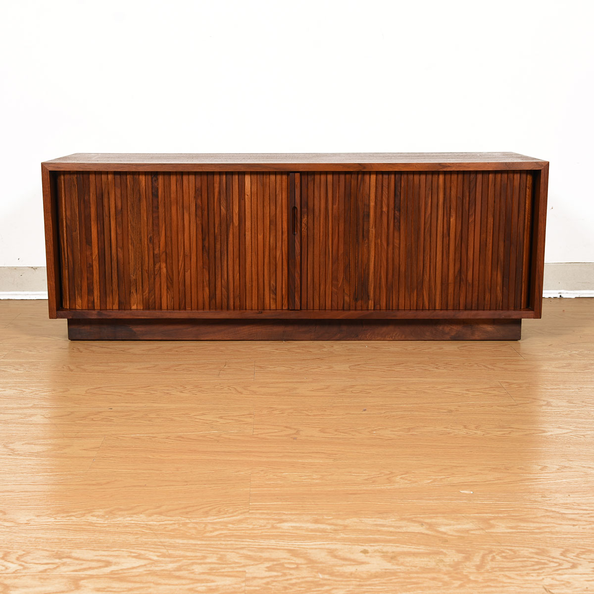 Vinyl is making a comeback and here is an authentic way to store your collection in a piece from the true heyday of recorded albums. These are designer tambour door cabinets in walnut, designed by Milo Baughman for Glenn of California.