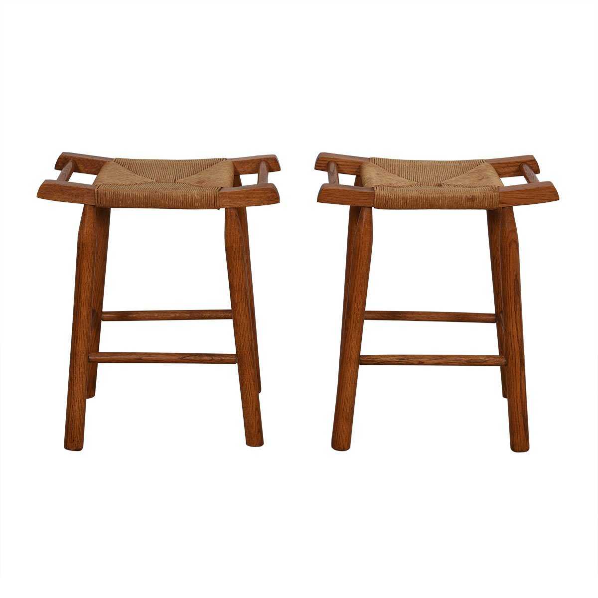 Pair of Rattan + Walnut Mid Century Modern Stools