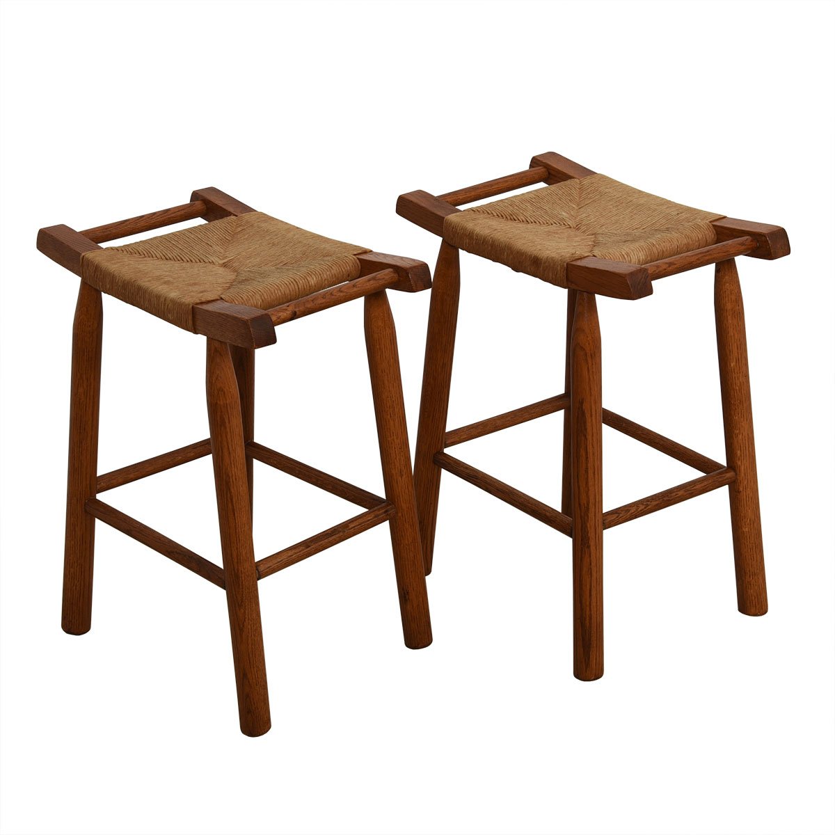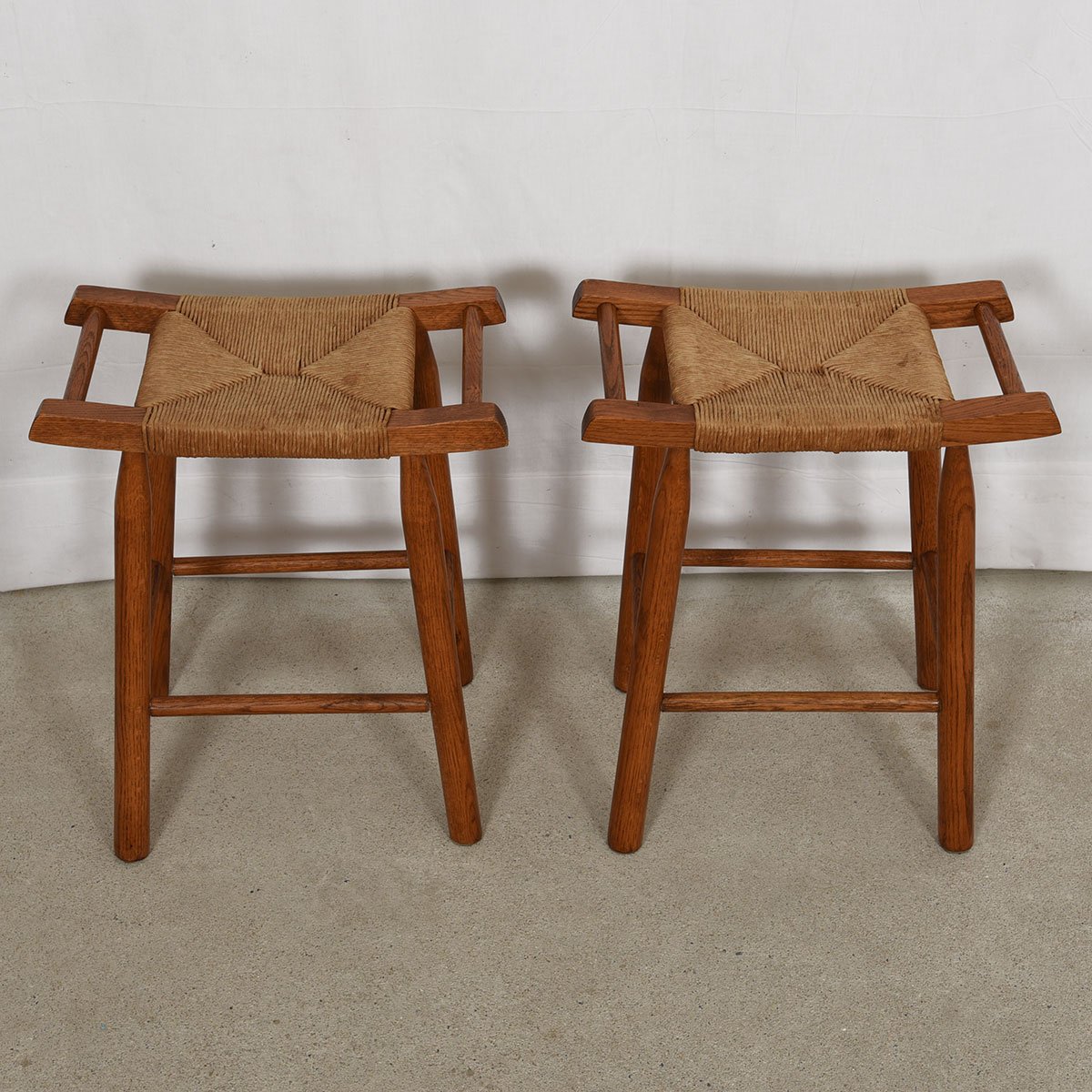 Classic Danish design is apparent on this beatuiful pair of stools. They feature a wide saddle top with a corded-seat. The turned legs have stretchers all around for added support, and contribute to the cozy & homey nature of these stools.