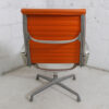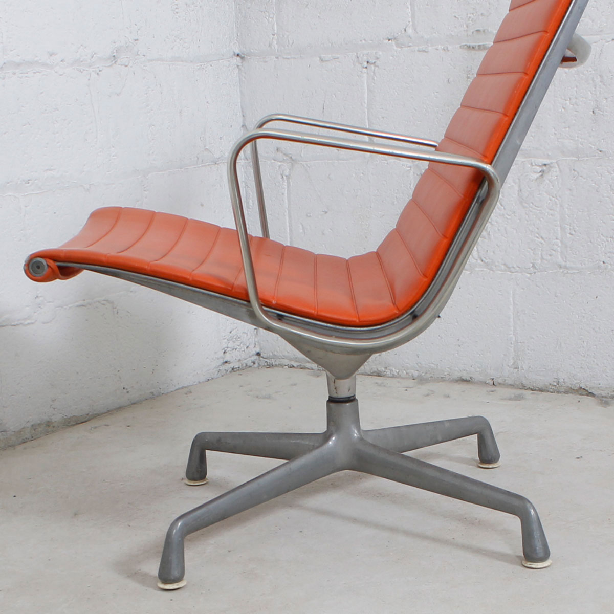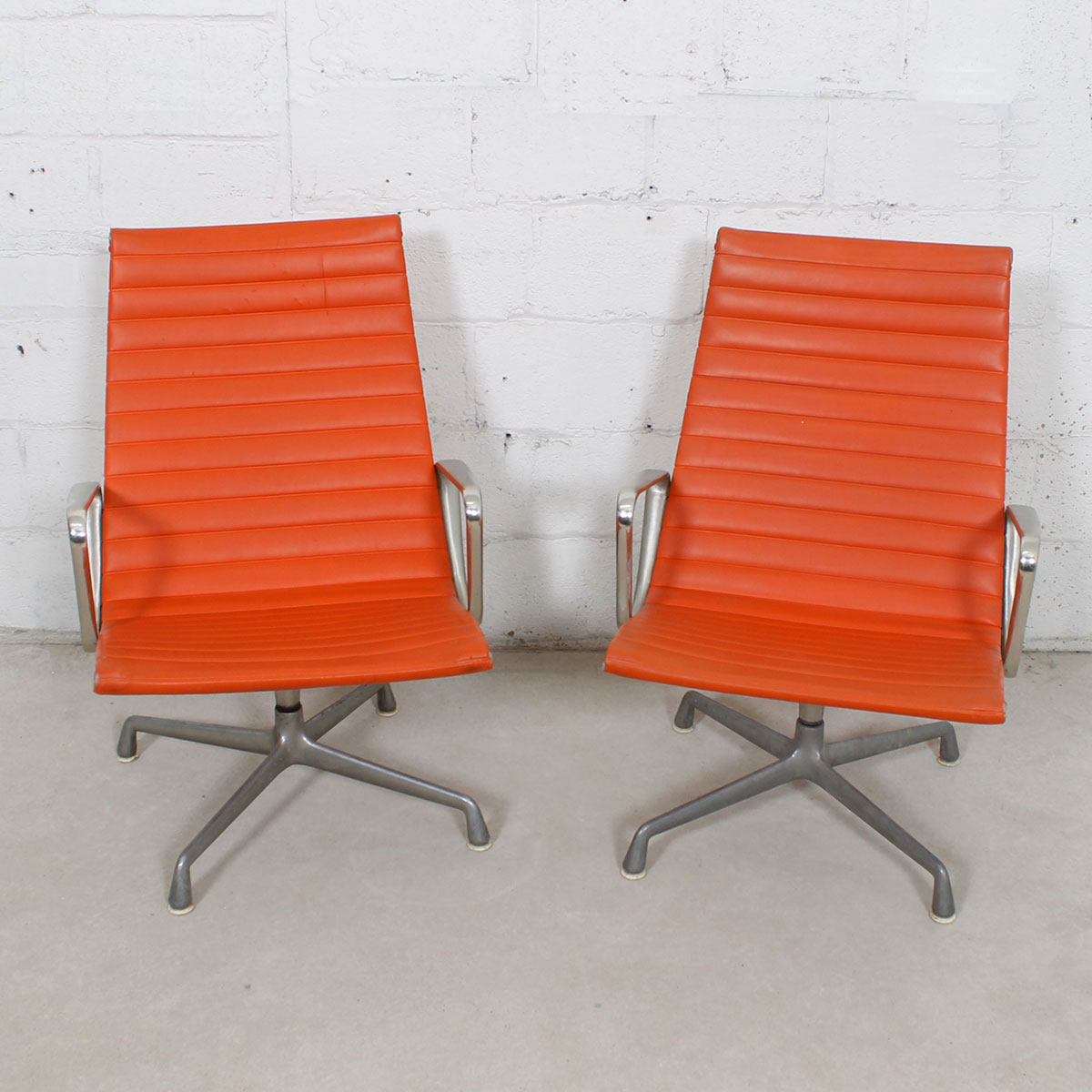We are proud to offer this pair of vintage Herman Miller Aluminum Group lounge chairs designed by Ray and Charles Eames. They feature die-cast aluminum four-prong star swivel bases (known as the “Universal” base, which dates this pair to the mid-’60s) with original period tangerine-orange vinyl upholstery. What a fabulous color! Vinyl & aluminum both show signs of use.