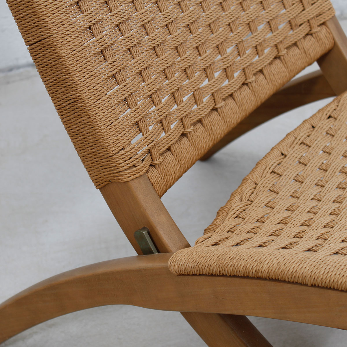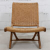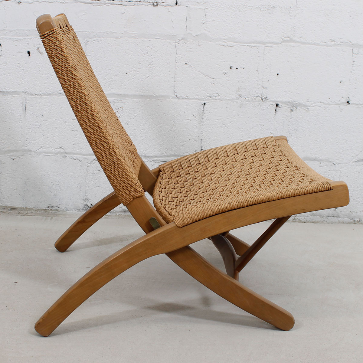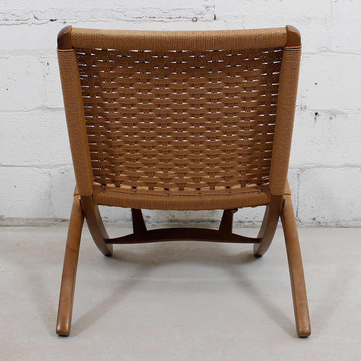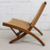 We are pleased to offer this remarkable pair of folding lounge chairs with Danish cord seats and backs. The classic mid century modern design after which these chairs are based was originally created by Hans Wegner. Folds to make storage easy if you use them as occasional chairs or moving between the inside and outside. Beautiful when seen from every angle.
