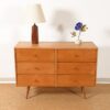 Dresser by Paul McCobb. Has six drawers with a small brass pull. Splayed legs end in brass caps.