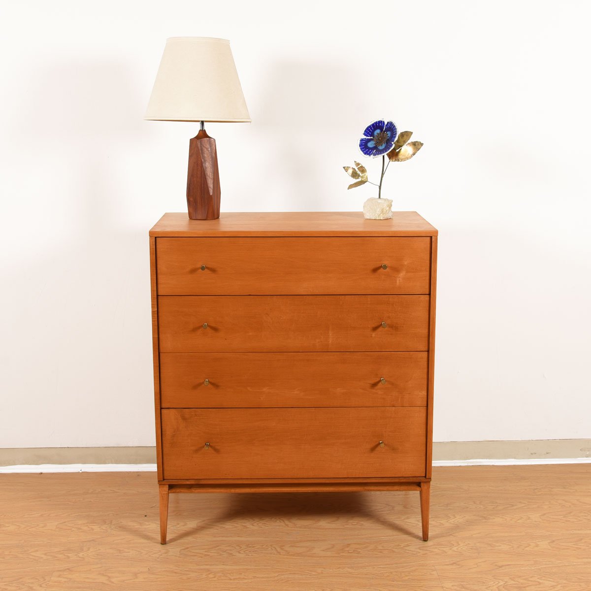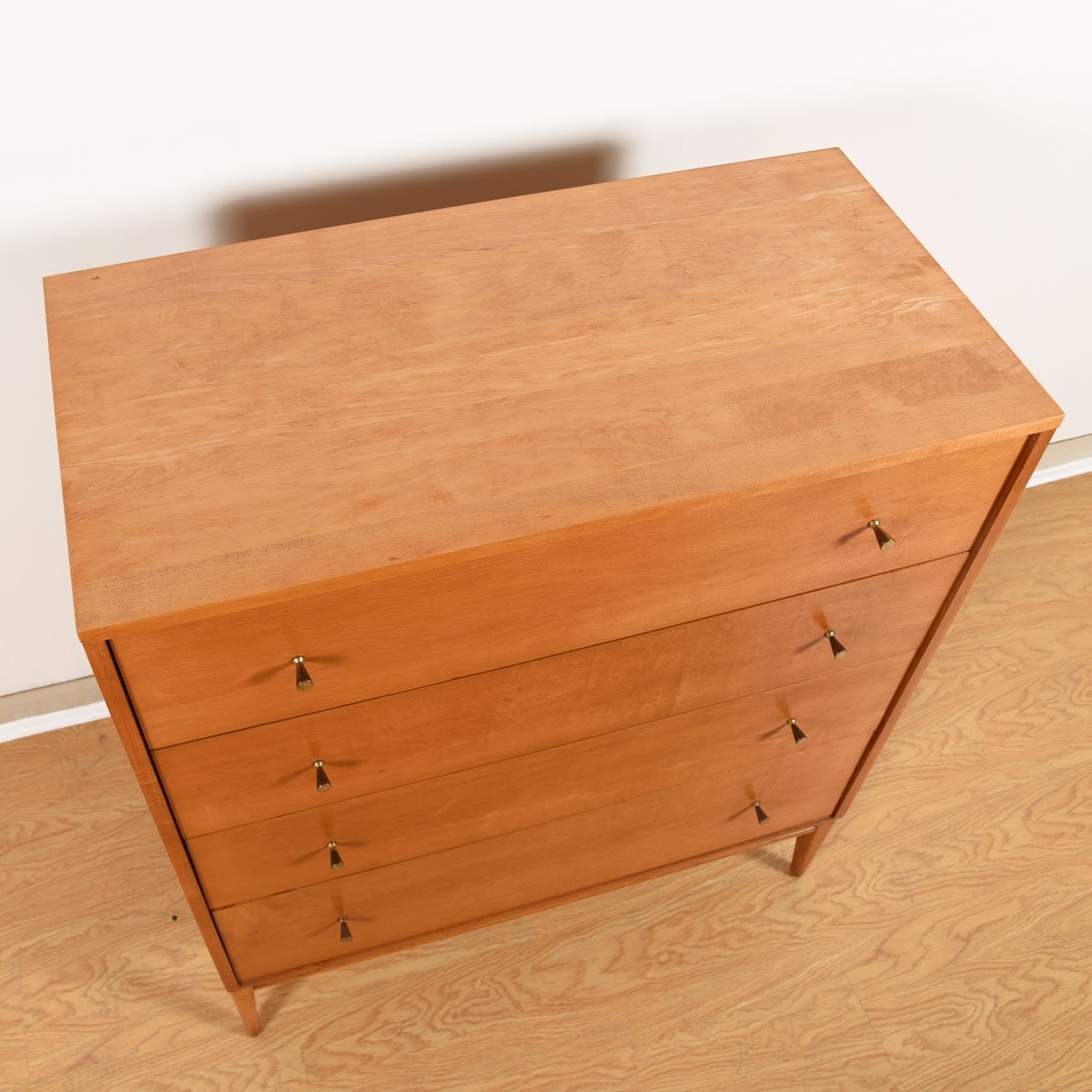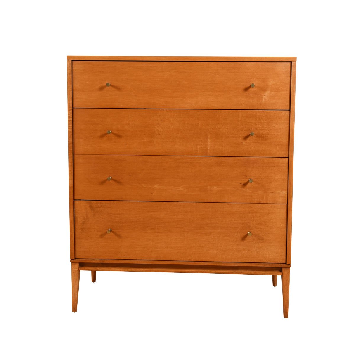 Good looking tall dresser by Paul McCobb has four graduated drawers, each with the small signature brass knob.