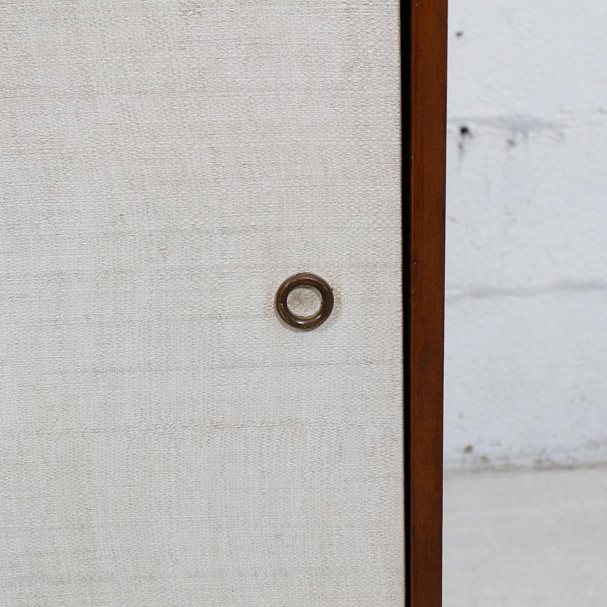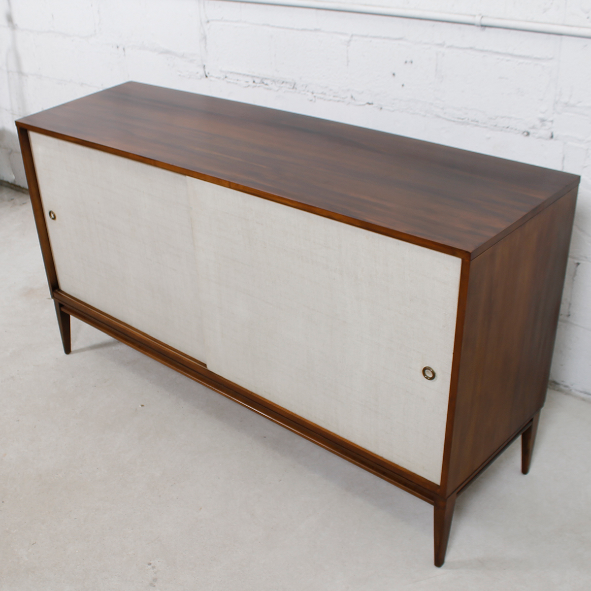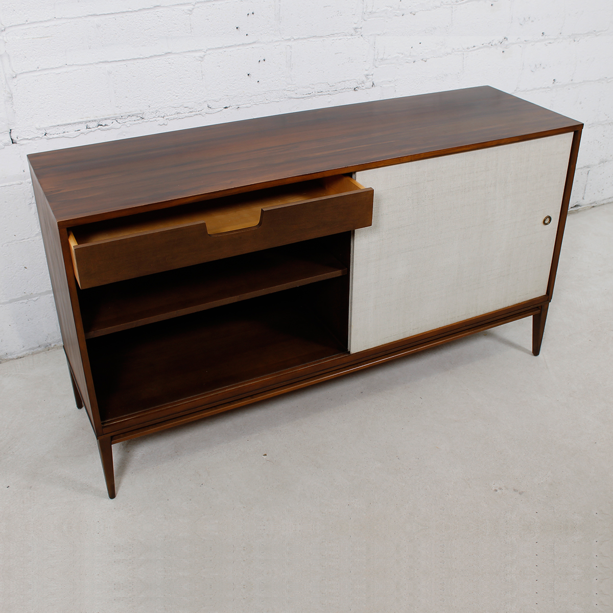 Paul McCobb Planner Group credenza manufactured by Winchendon, circa 1950’s. Nice clean lines. Constructed of solid maple, stained a deep walnut tone which provides a beautiful contrast to the creamy grasscloth sliding doors.